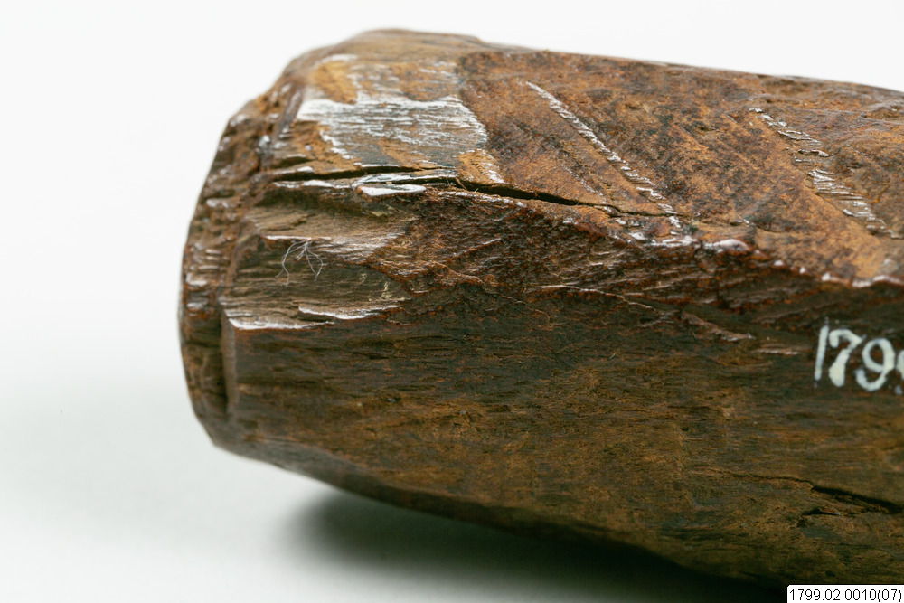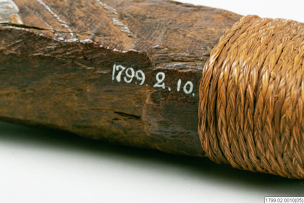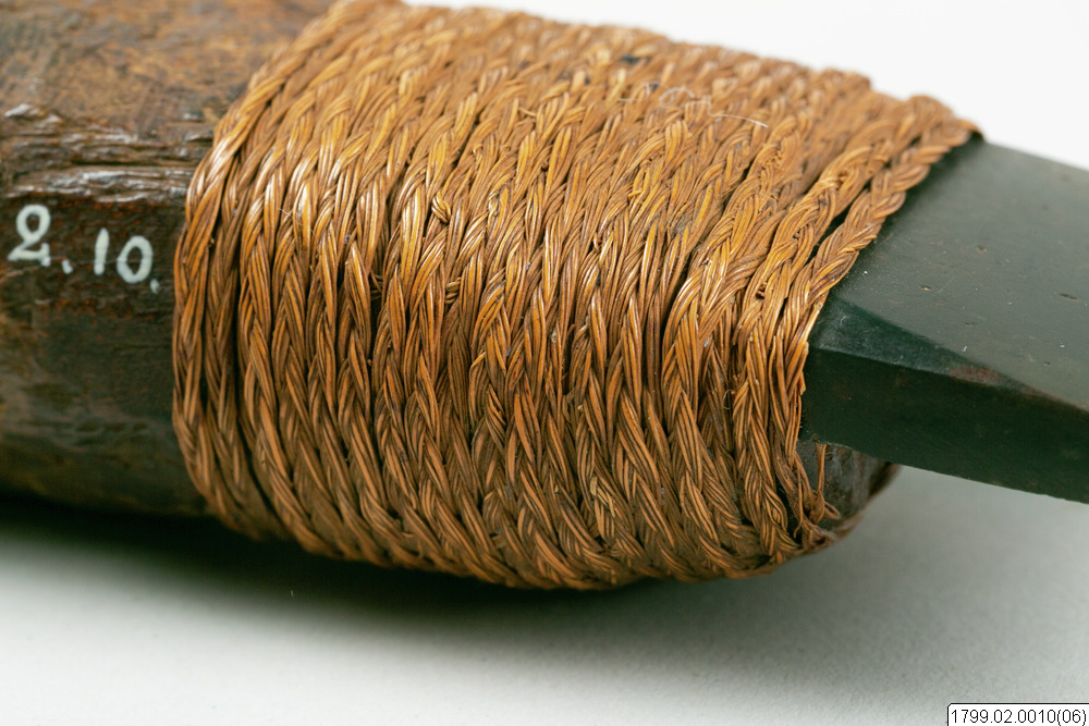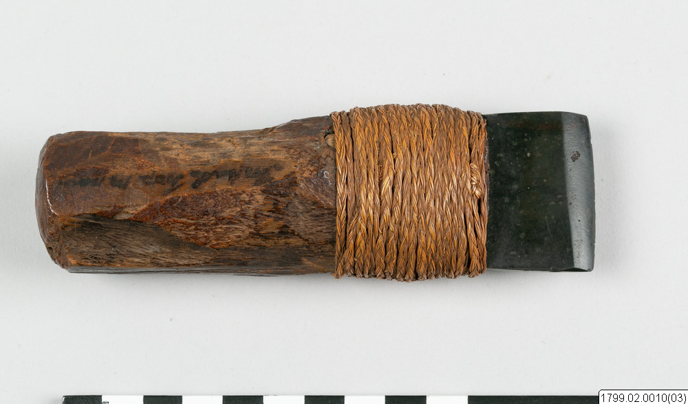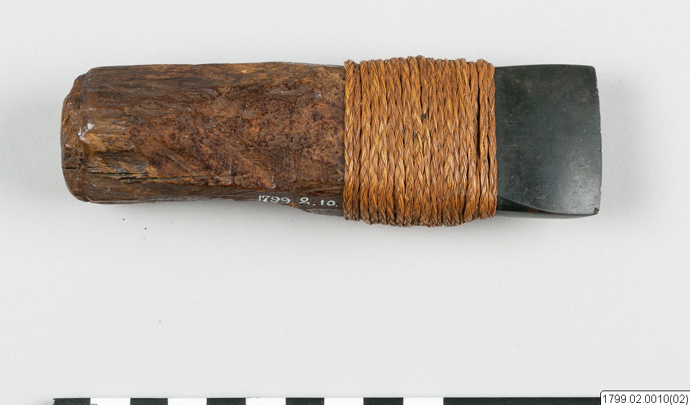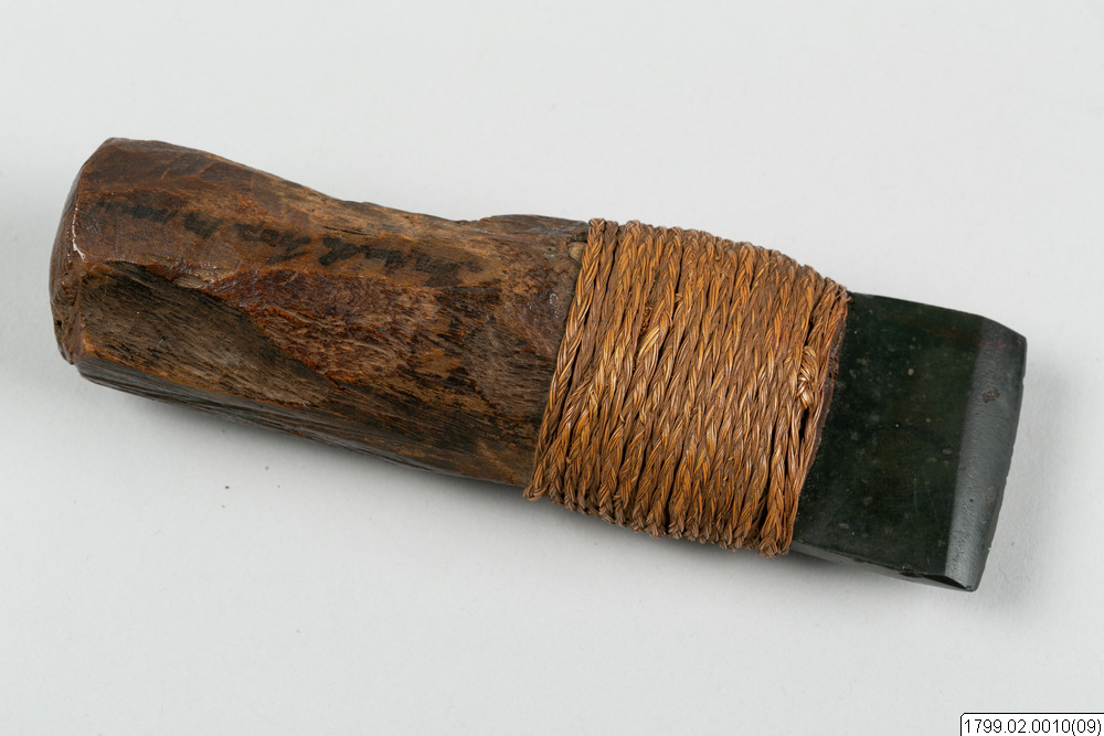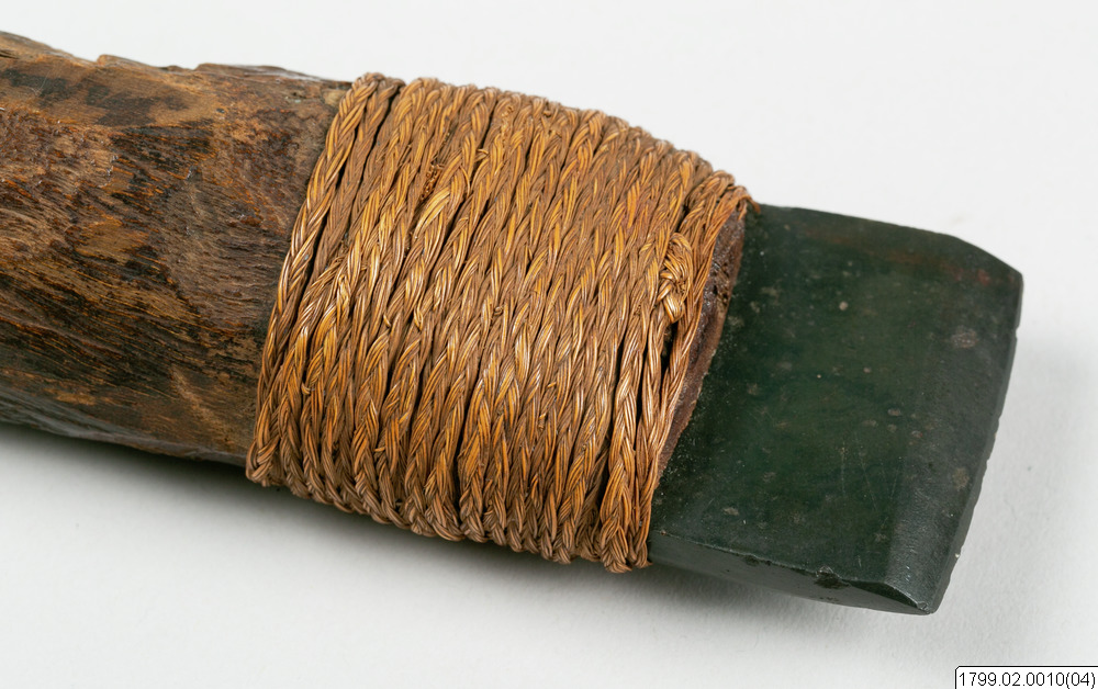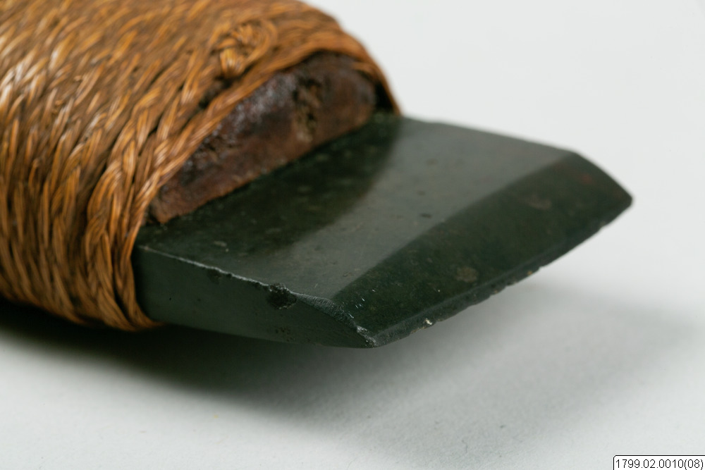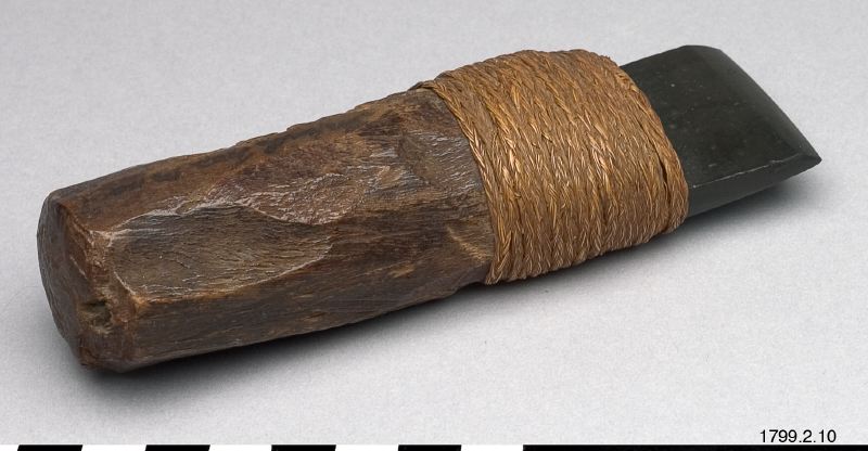 - Rätmejsel av slipad basalt. Fäst vid träskaft med flätor av kokosfibrer.