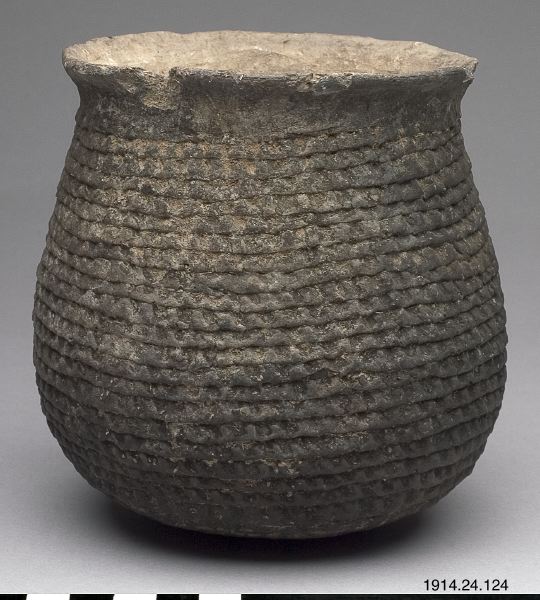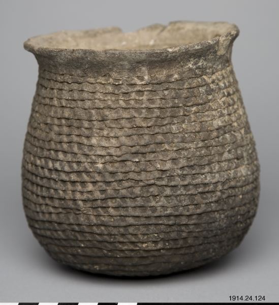 - Av blåsvart gods, insidan ljus. Svagt bukig form med rundad botten och utsvängd mynningskant. Hela yttersidan fingerintrycksornerad (enligt generalkatalogen). Mynningen naggad.