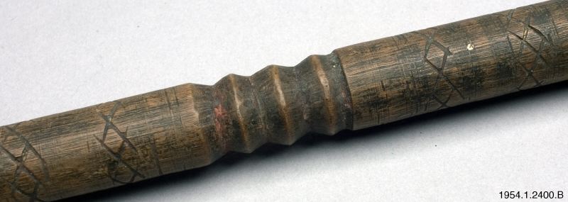 Dekorerat träskaft. Skaftet har fina tunna dekoreringar i rutmönster samt utsnidade partier som löper runt skaftet, som ringar. Vid skaftfästet mellan skaft och huvud sitter en mässingsring.