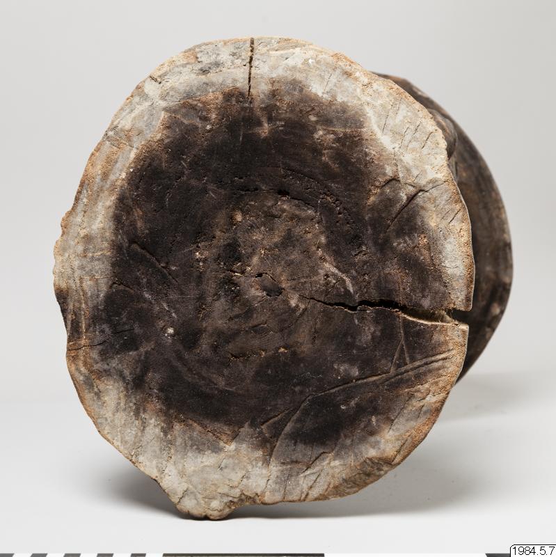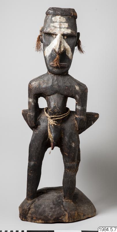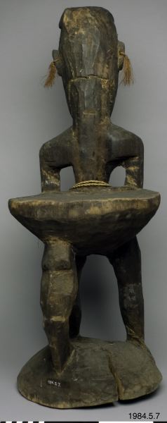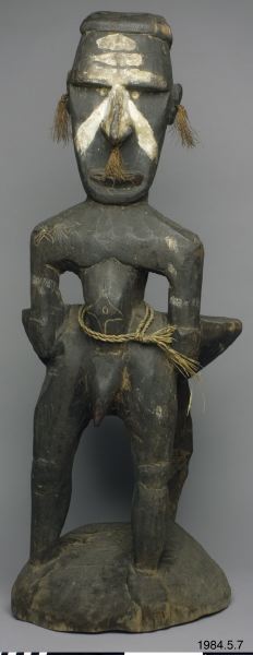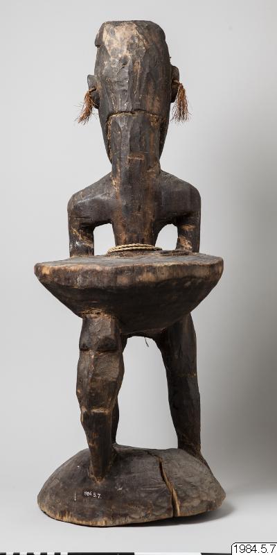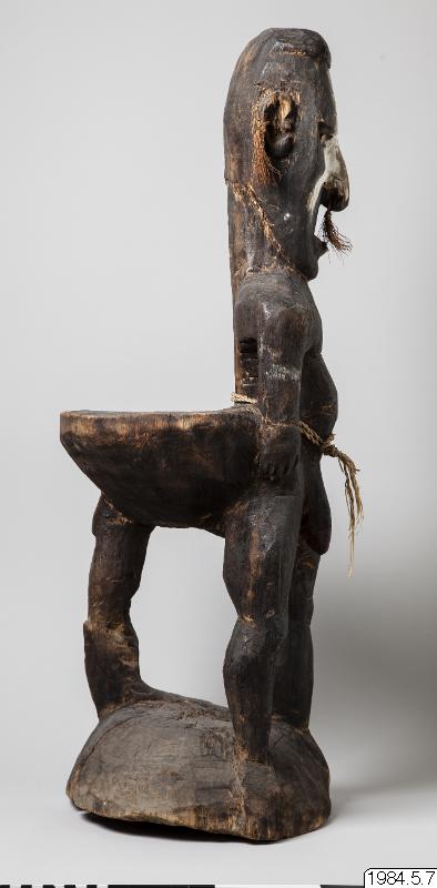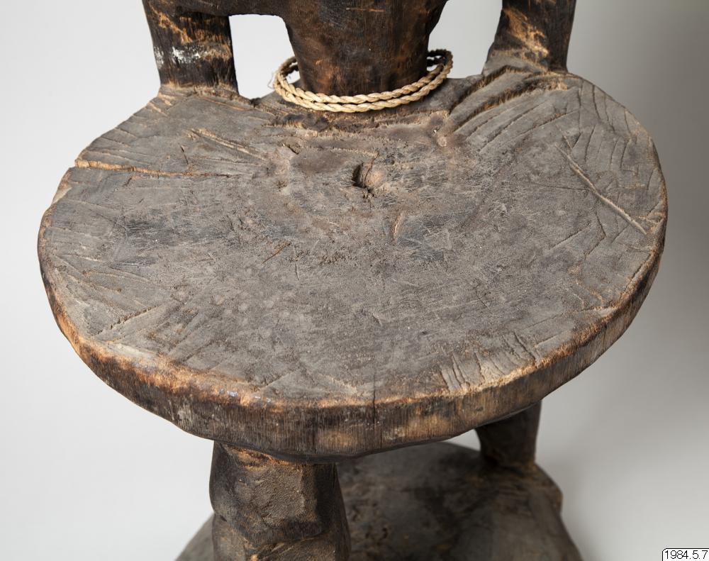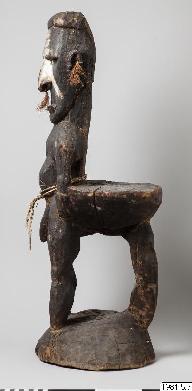 Stol av ljust brunt trä med mörk patina, skuren ur ett stycke trä. Längst ner en rund stor sockel från vilken tre ben går upp mot sitsen. Två av benen utgör kroppen av en mansfigur som funkar som ryggstöd på stolen, det andra är böjt. Figuren är vänd ut från stolen. Figuren har inga fötter. Armar som hänger neråt ut från kroppen med händer vilandes på höfterna, varav en har fem fingrar och den andra har fyra. På magen har figuren ett mönster som påminner om en stjärna och på höger skuldra tre horisontella parallella vågformade streck, utskurna i låg relief. Vidare har ett tvinnat band av växtfiber virats två varv runt magen på figuren. Spetsen på penis har målats röd. Armarna har spår av band målat i vitt. Opropertionerligt stor genomborrad näsa. Läppar modellerade av lera. Ögon gjorda av snäckskal och markerade ögonbryn. Utstående genomborrade öron med växtfibersnören knutet i hålen. I pannan är figuren målad med tre vita parallella horisontella streck, vidare är ett uppochnervänt V målat från näsroten ut mot kinderna. Huvudet avslutas i en utskuren knopp.