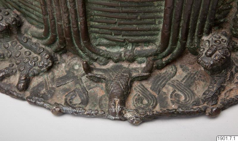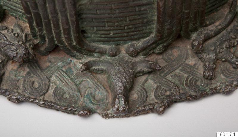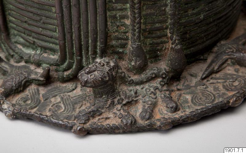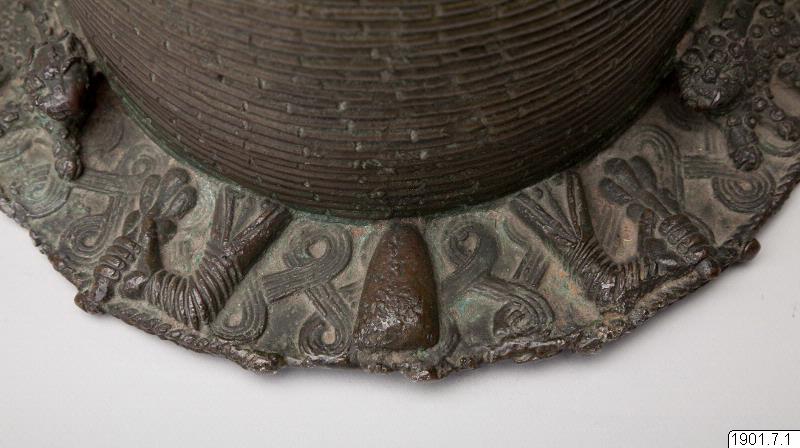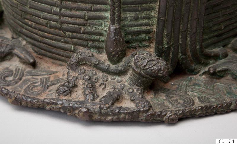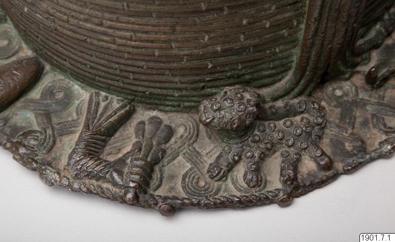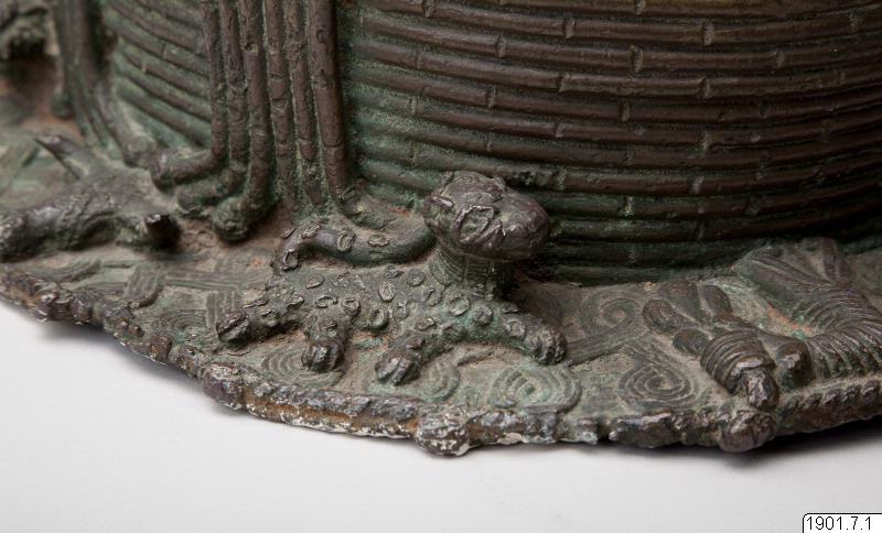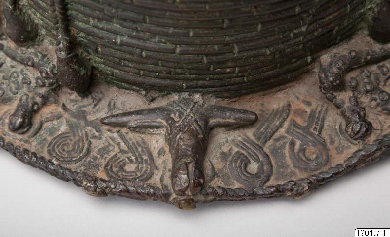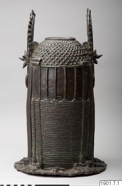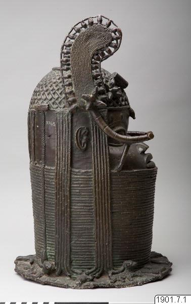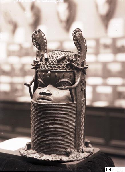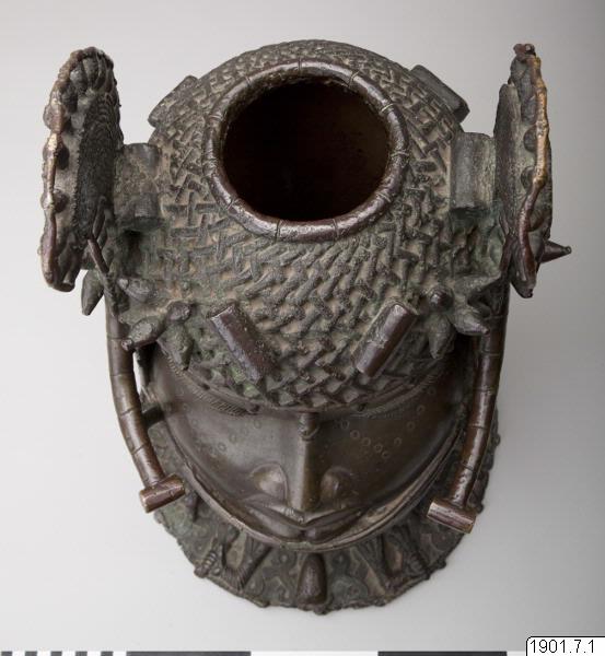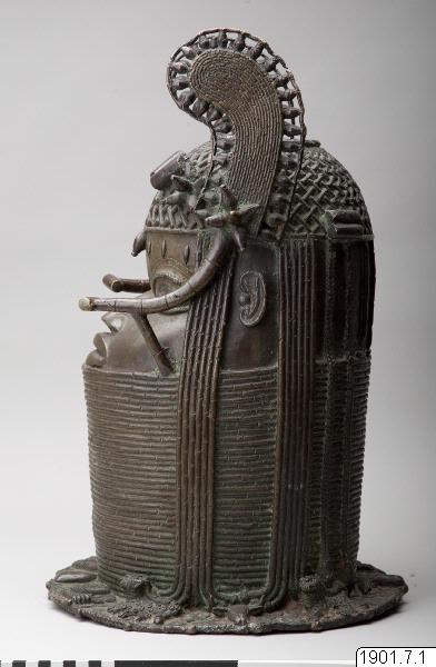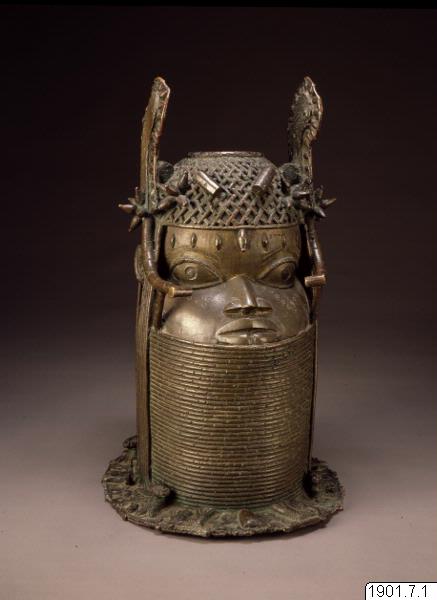 Utställningstext STADEN (kopplat till föremålet): Minneshuvud över en Oba gjutet på 1800-talet på begäran av någon av de tre kungarna Osemwede, Adolo eller Ovonramwen. Huvudet är försett med de två "vingar" av korall som sägs ha införts på den kungliga huvudbonaden under den första hälften av 1800-talet.