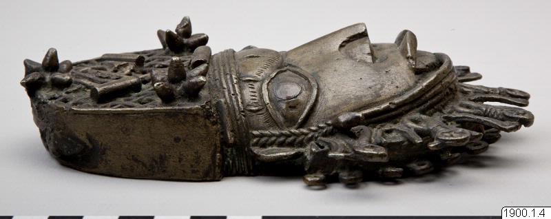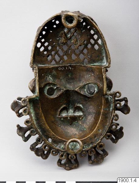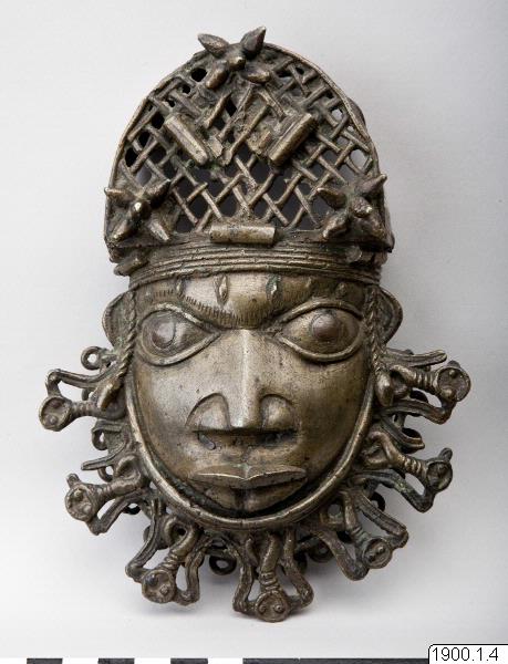 Utställningstext STADEN (kopplat till föremålet): Höftornament i form av ett manshuvud avsett att bäras av hövdingar vid vänstra höften och täcka tillslutningen av deras svepkjolar. Sent 1800-tal. Utställningstext STADEN: Det kungliga palatset var också platsen för en av de mest fascinerande konstformerna i Benin- rektangulära bronstavlor med avbildningar i relief av personer och händelser i det ceremoniella livet vid hovet. Omkring 900 sådan relieftavlor finns kvar i världen idag och sägs i det gamla Benin ha hängt uppspikade på de takbärande pelarna i palatset, där de bildade en imponerande fond för de hovceremonier de delvis också avspeglar.