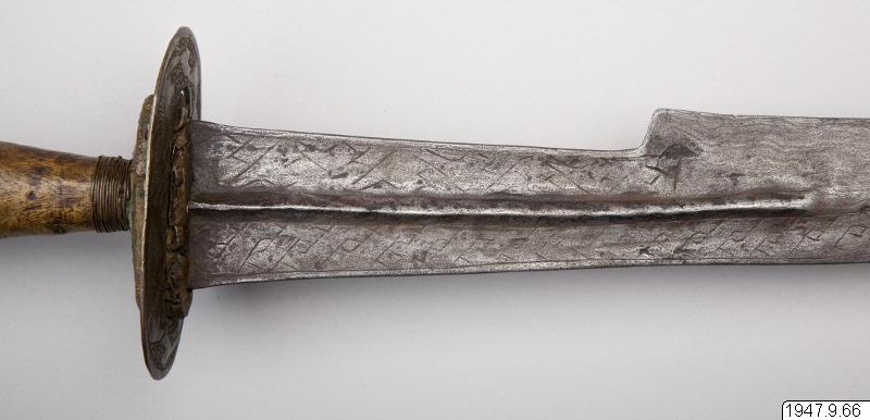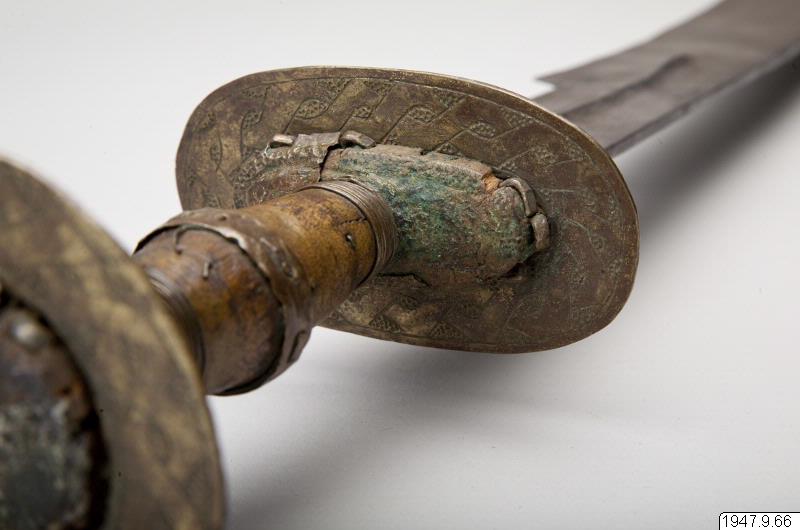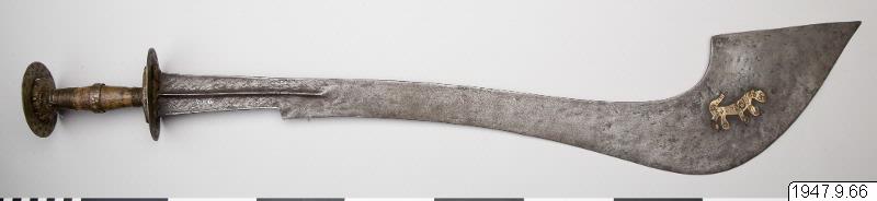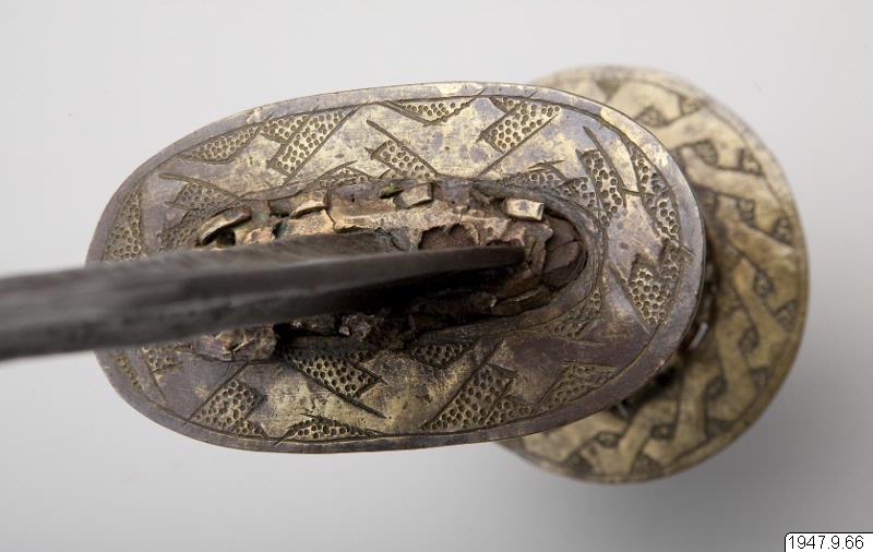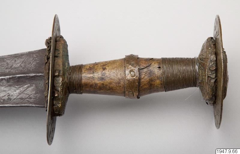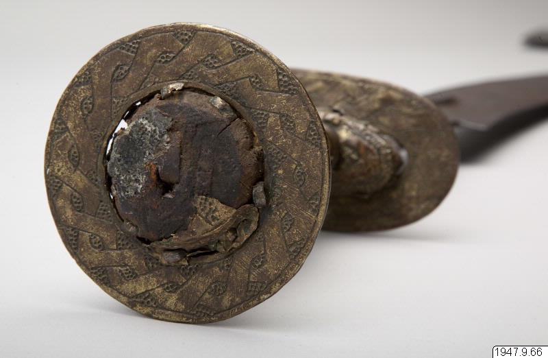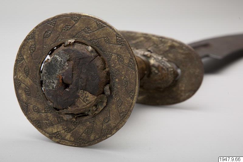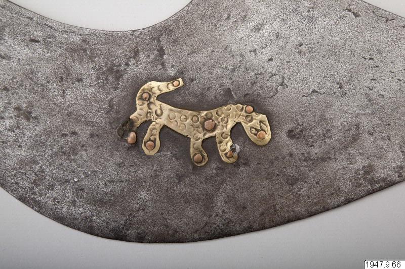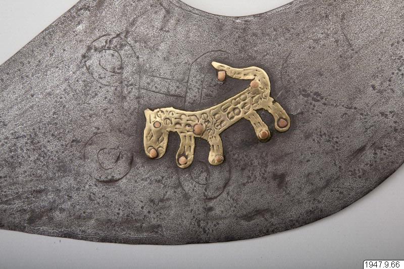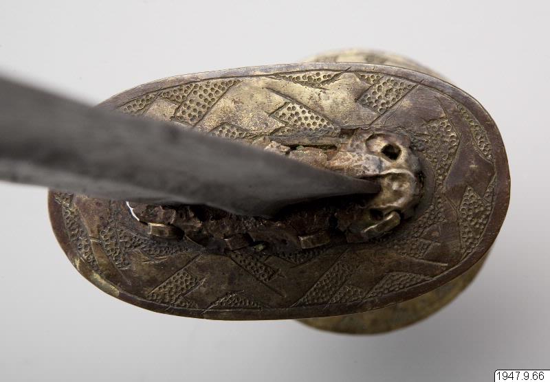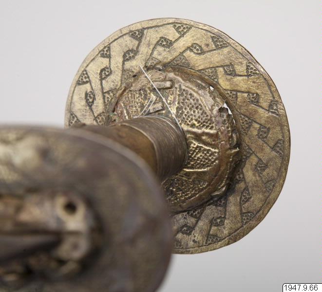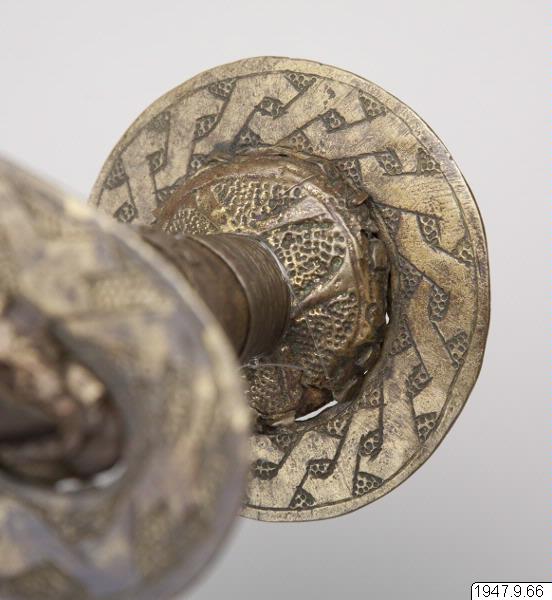 Ornerat fäste, begränsat av två tvärställda skivor och med en liten leopard av mässing ritad på båda sidor av klingans nedre, bredare del. Leoparden sitter på ett på klingan inristat ögle- eller knutornament.