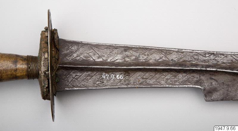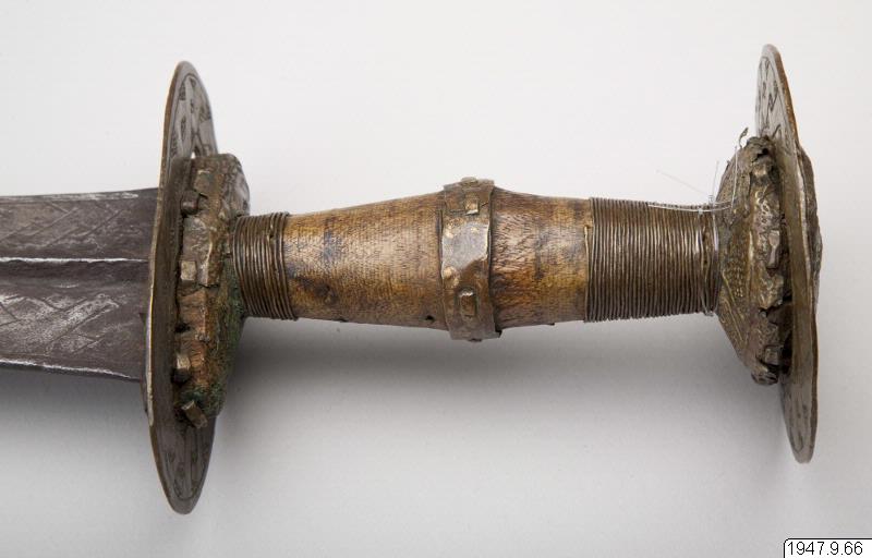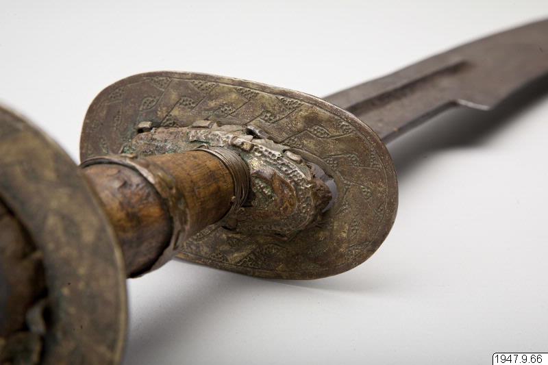 The state sword, ceremonially borne before the Oba as a symbol of his power over life and death of his subjects. At the ceremonial appearances of the Oba this sword should in accordance withtradition be borne by a naked youth. 17th century. (Staden-Benin); Ceremonial sword