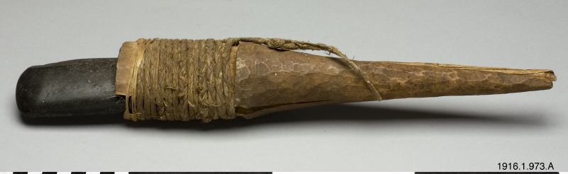 Klämma/del av yxa. Två kilformade trästycken i vilka yxbladet är inkilat och sedan fastsurrat med flätat växtfibersnöre. Denna surras sedan fast vid yxskaftet. Blad av basalt.