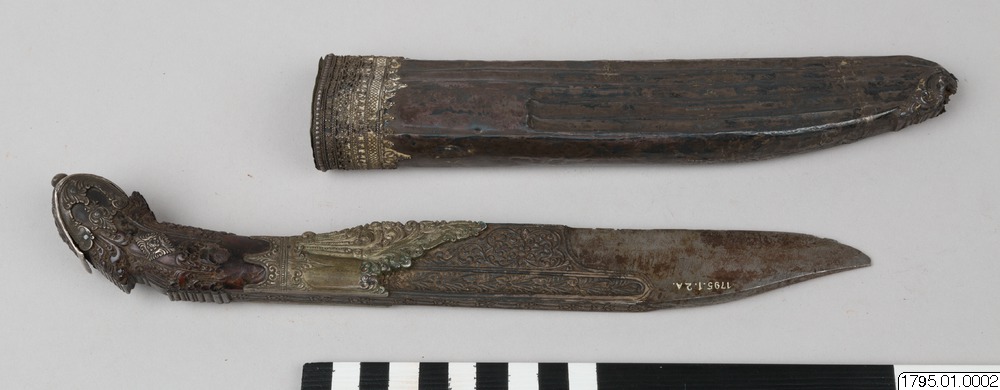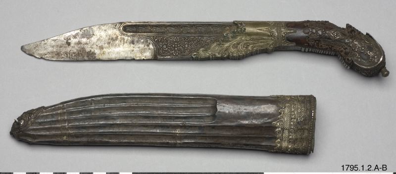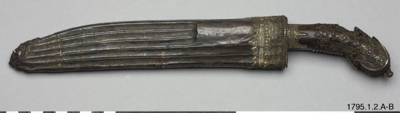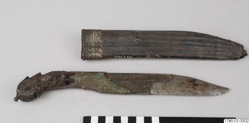 - Kniv, eneggad, med silverbeslag på skaft och slida. (generalkatalogen)