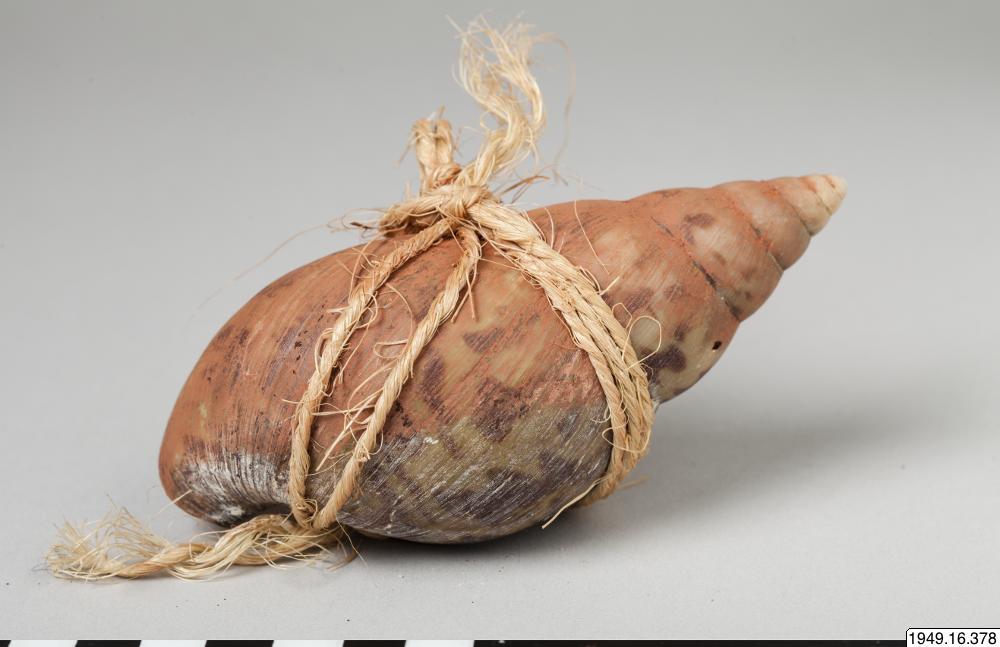 Ur generalkatalogen: Snäcka, rödfärgad, ombunden med basttråd, fylld med magiskt stoff.