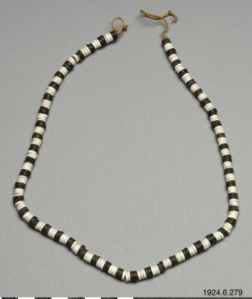 - Halsband som består av små skivor av vitt snäckskal varvat med bruna skivor av kokosnötsskal uppträdda på ett växtfibersnöre.