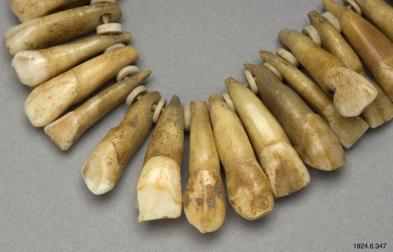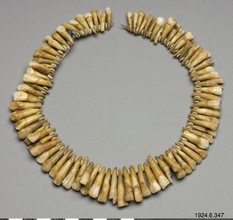 - Halsband bestående av framtänder från människa och varanannan snäckskalsskiva uppträdda på snöre av kokosfibrer.