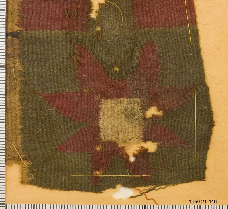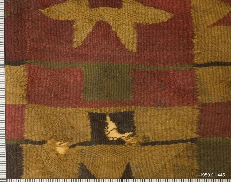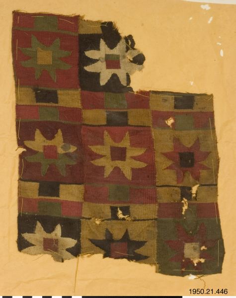 - Gobelängvävd med olikfärgade rektanglar med stjärnor i, ev. Chiquibamba stil. Uppsydd mot smörpapper. Dok e uppackning.