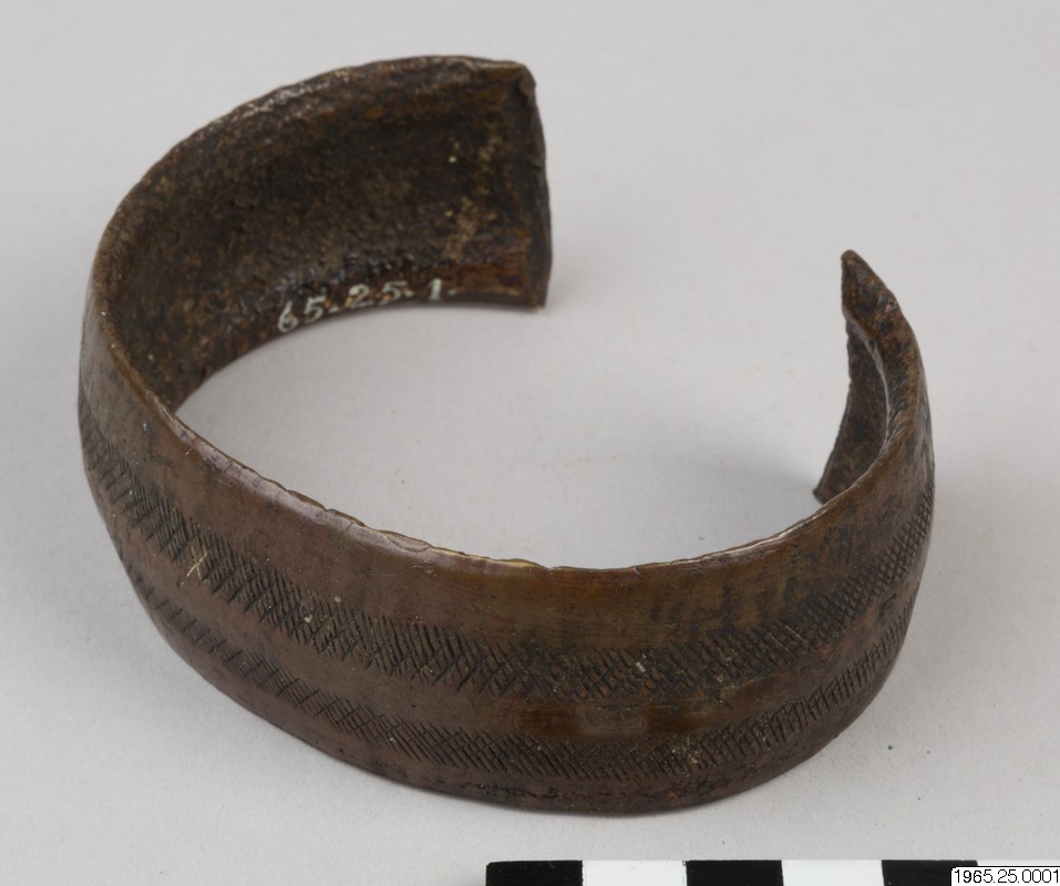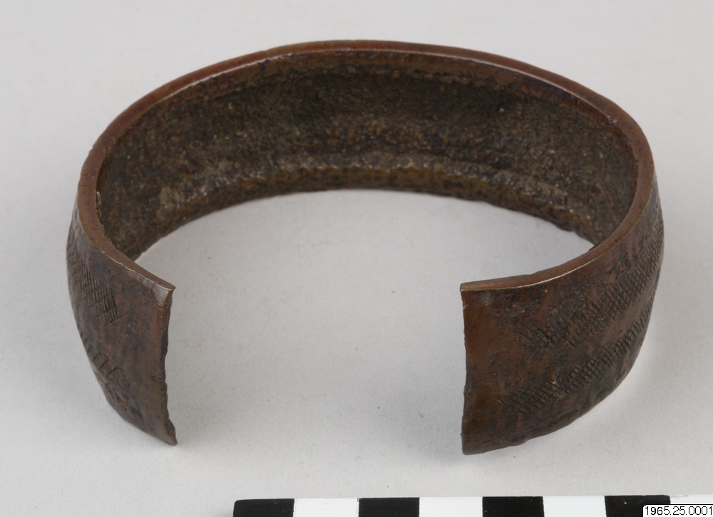 - Armring av brons, gjuten, öppen ring. Mönster i form av två inristade, parallella, längs- löpande bårder med korslagda streck. Denna ring ingår som en del i ett helt komplex i samband med att hövdingar bärs på bärstol för att invigas i sitt ämbete, motsvarar ungefär "regalier", jmf inv, 1964.4.1 - bärstolen. Diam. 10 cm, bredd 4 cm. Kongo