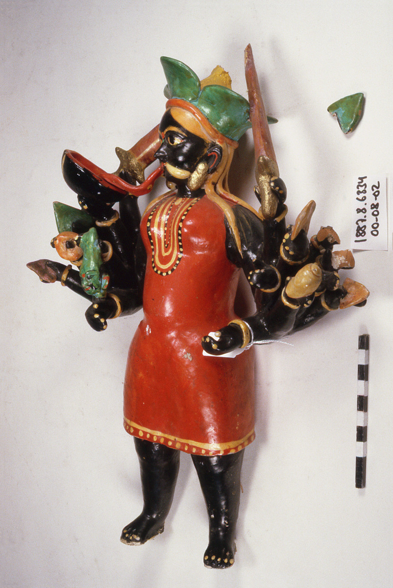 Ikonografiska detaljer: I vänstra handen (övre) håller hon i ett svärd (khadga), därunder en yxa, en snäcka (sankha). I högra handen (övre) håller hon i ett svärd (khadga), därunder en skål med blod eller vin, en klubba (gada), ett avhugget huvud, en diskus (chakra) - ett vapen som är specifikt förknippat med Vishnu och dennes avatarer. I indisk krigsföring var diskusen tillverkad av stål och hade ett hål i mitten och den yttre eggen var skarpslipad. (Stutley, 1985: 57.) (Niklas Foxeus, 2000)
