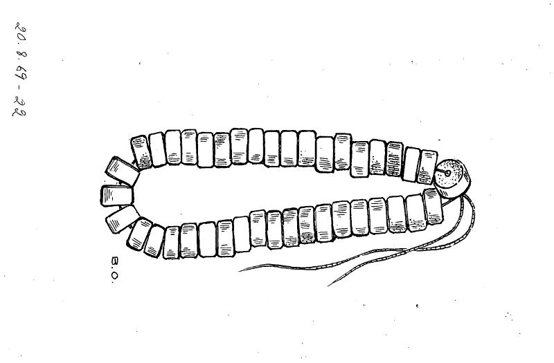 - Pärlband av 41 gråa pärlor. Användes som halsband, ev som gördelband. Insamlad omkring 1936 (generalkatalog)