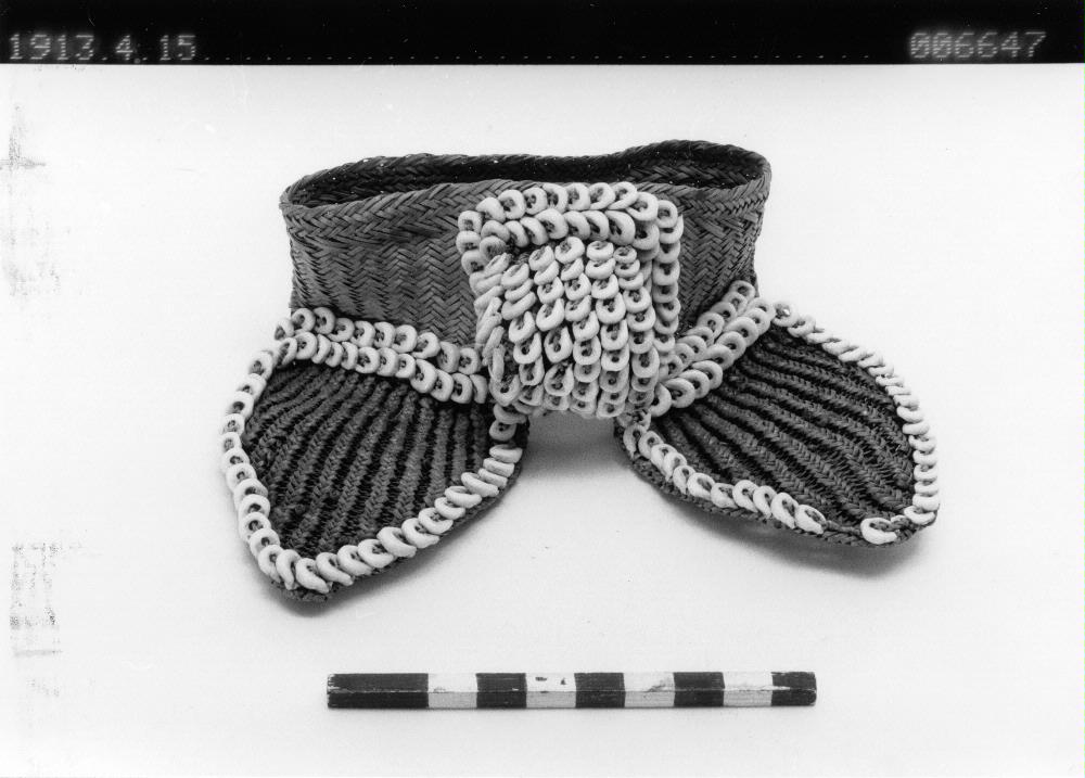 - D:o En rang av ljusbrunt flätverk har på framsidan 2 platta, ut stäende bihang (fig) flätade med upphöjda ränder efter annan teknik. De äro kantade med vita musselpärlor. Ringens längd 11,6 cm. Bredd 4 cm.