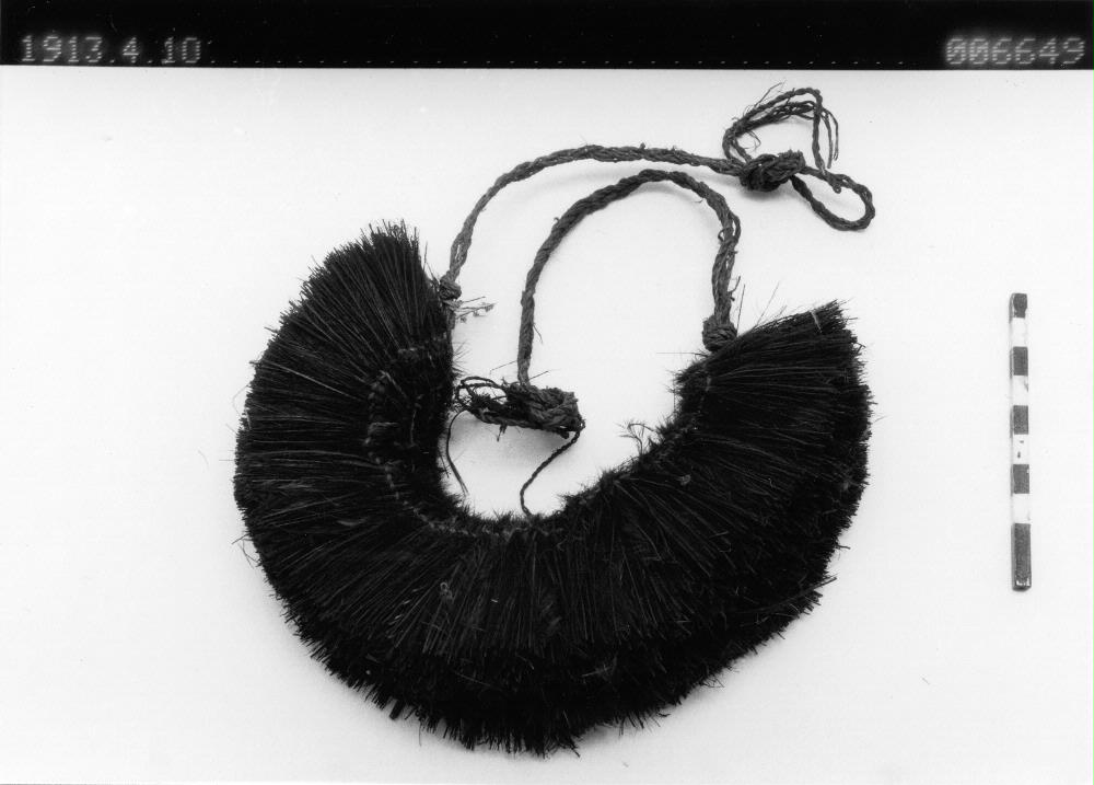 - ( armband) av kaeuarfjädrar. Se Reche,s. 83 och Taf.X. De jämt skurna fjädrarna äro fästade med bruna snören,som sedan fortsätta hopflätade till knytband. D:o En blandning av kasuar-och andra smutsbruna fjädrar. Knytbanden bestå av korta ändar av de snöre vid vilka fjädrarna fästats.