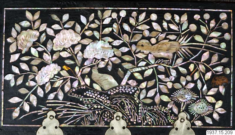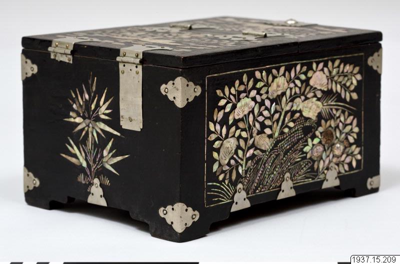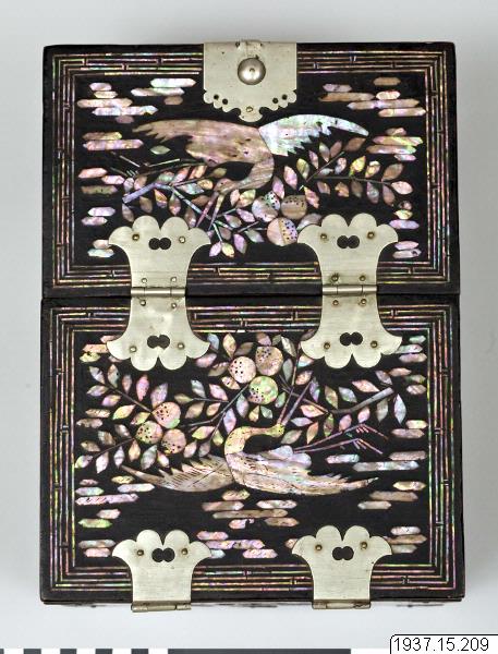 Svartlackerat skrin med pärlemorinläggningar. Uppfällbar spegel samt utdragbar låda. Eventuellt för export.