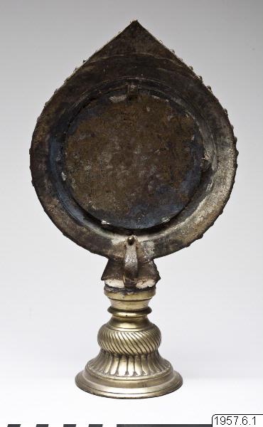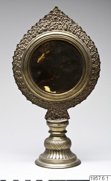 - Spegel på fot. Spegeln infattad i rund, ornerad ram som är spetsig i toppen.