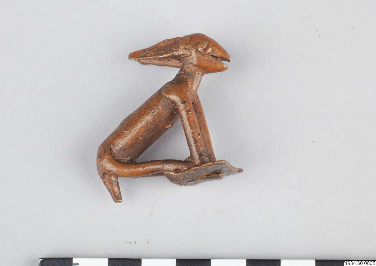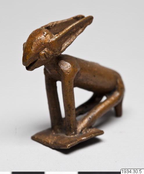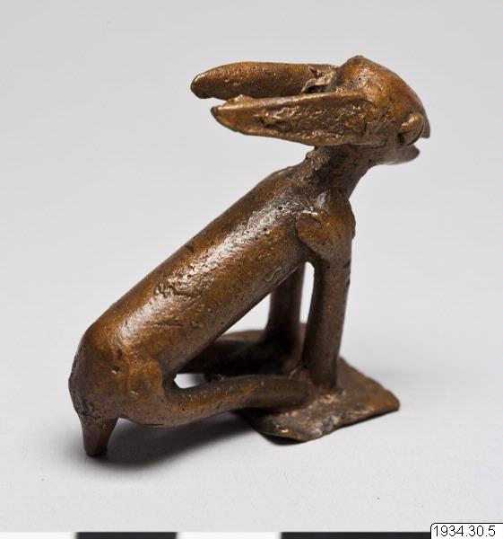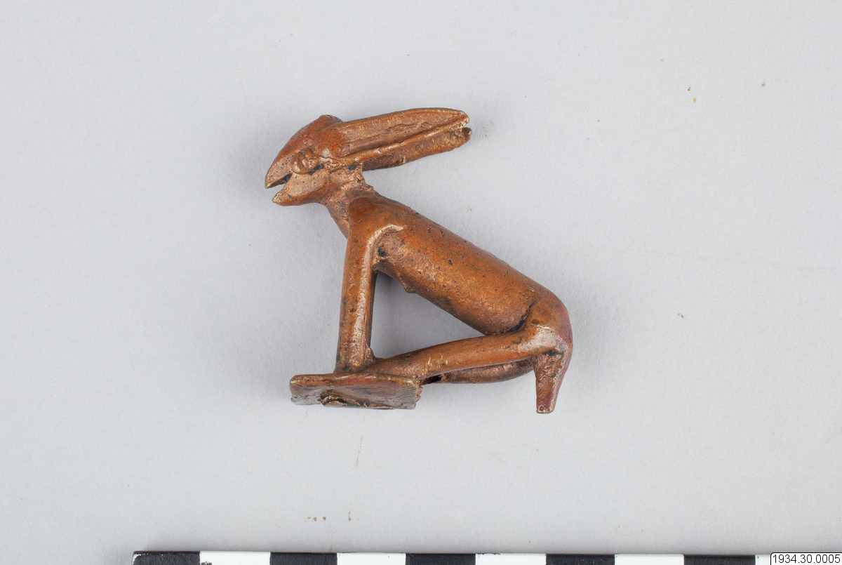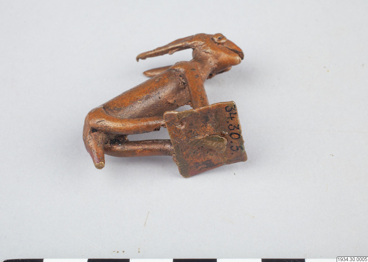 - Djurfigur, liknande en hare. Bronsliknande legering. (generalkatalogen)