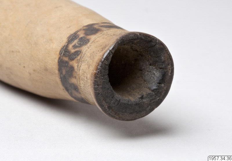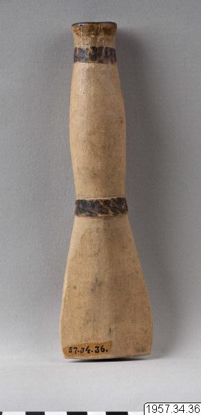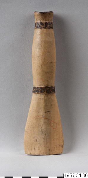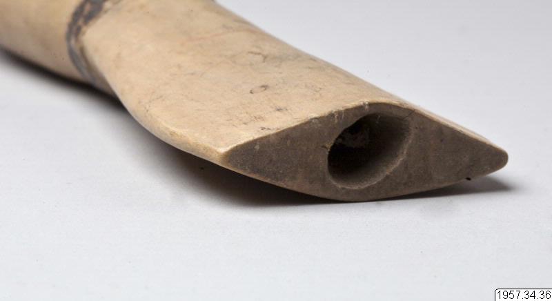 - Tobakspipa av trä. Spolformig med platt munstycke. Ornerad med två svartbrända reliefringar, den ena nedanför mynningen och den andra mellan munstycket och den spolformiga delen. Längd 18 cm Munstyckets maxbredd 5 cm. Mataco eller Toba