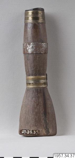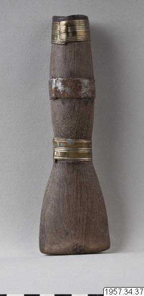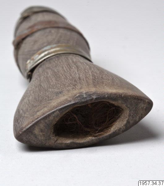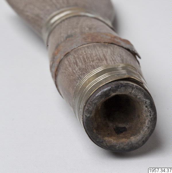 - Tobakspipa av trä. Spolformig med platt munstycke. Ornerad med tre ringformiga metallbeslag på den spolformiga delen. Längd 17 cm Munstyckets bredd 5 cm. Mataco eller Toba