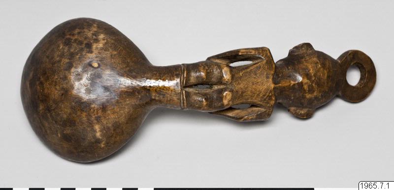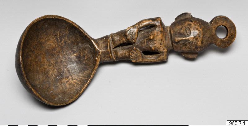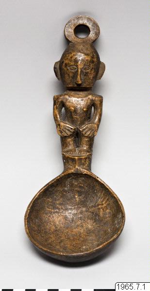 Slev av trä med, handtag skuret i form av en stående kvinna, som håller händerna på höfterna. Upptill avslutas huvudet i en ring, möjligen för upphängning. (Något angripen av mask.)