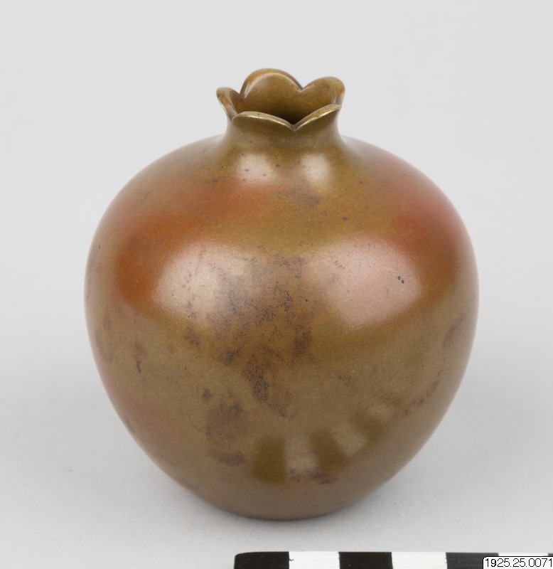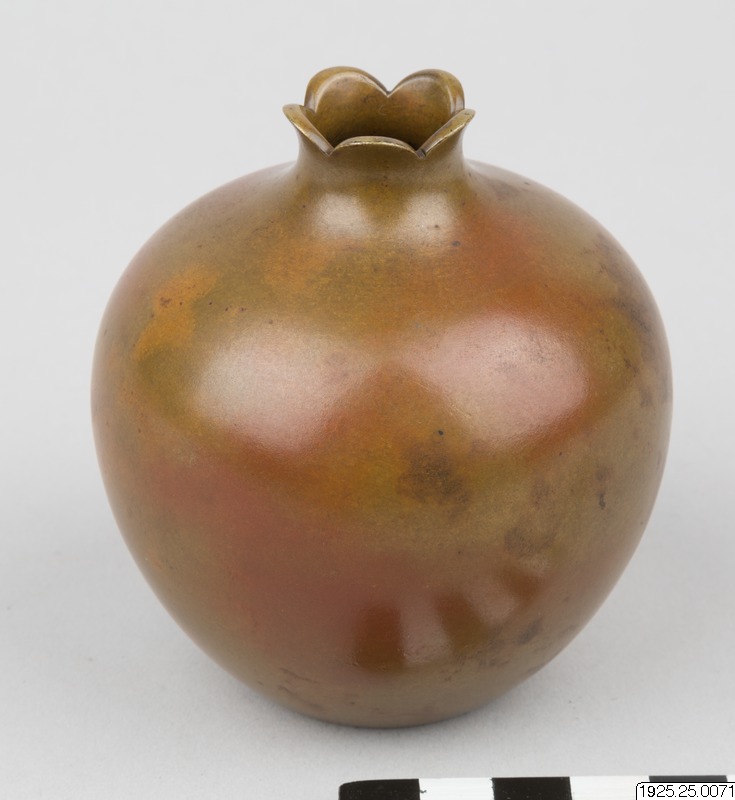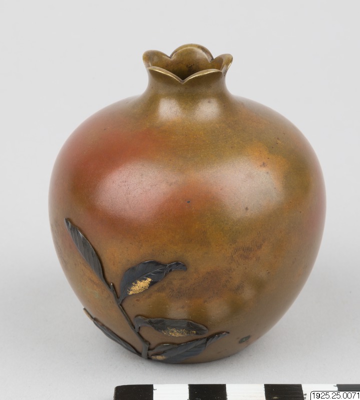 Vas av brun brons i form av ett granatäpple. Genom lyckträff har uppstått en rodnad som på ett verkligt äpple. Dekoration i relief: kvist av granatbuske, i shakudō med förgyllning. Gjord av Suzuki i firman Nogawa. Signerad i botten: "fabrikat av Yasa". (Enligt generalkatalogen).