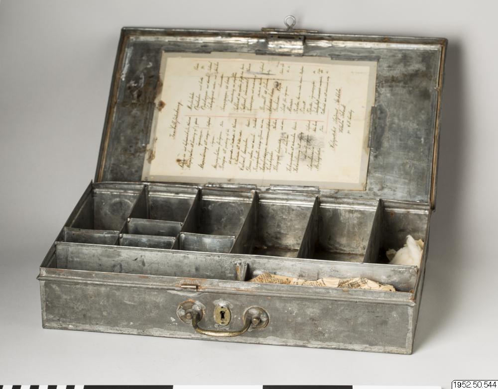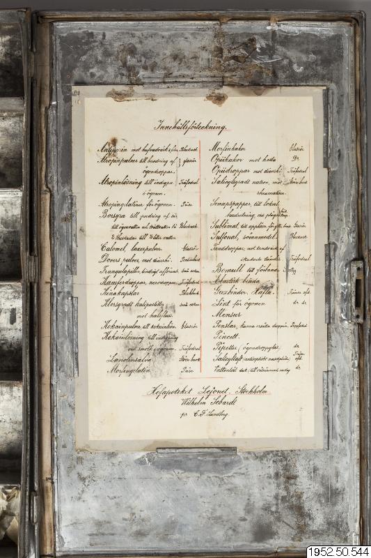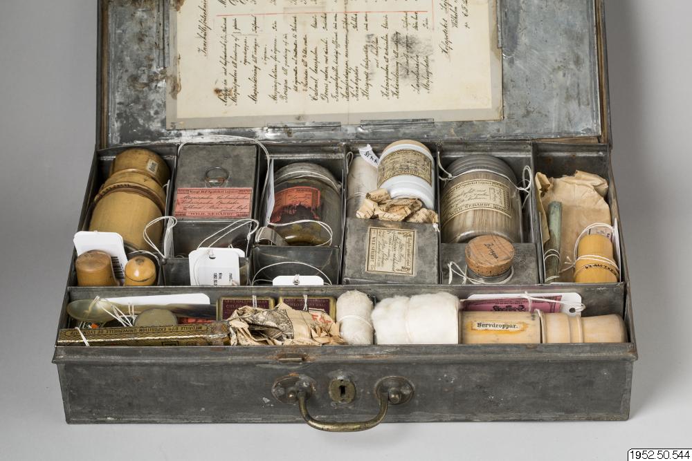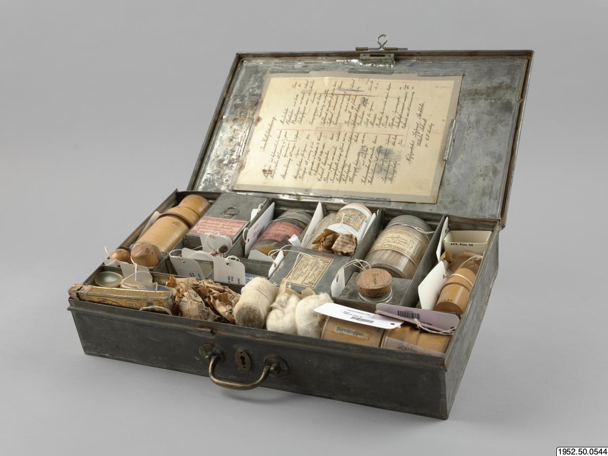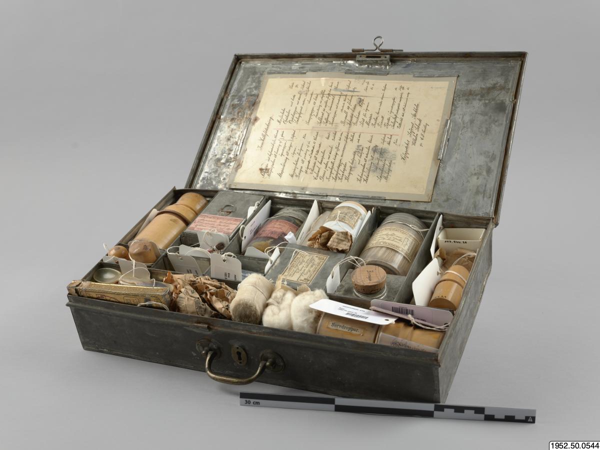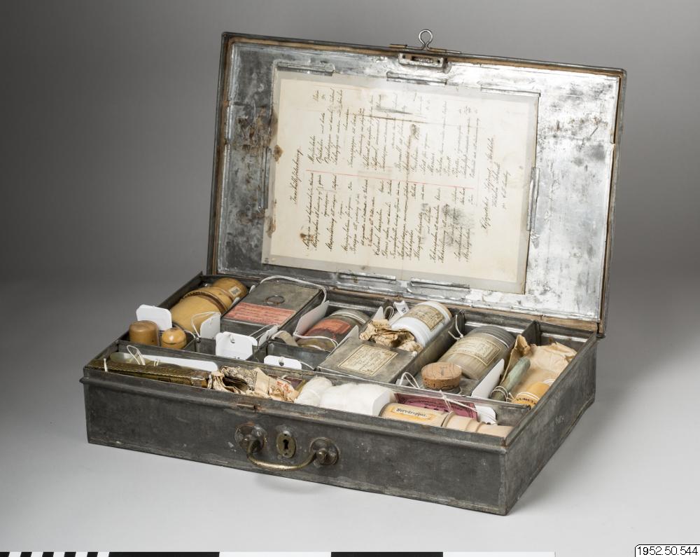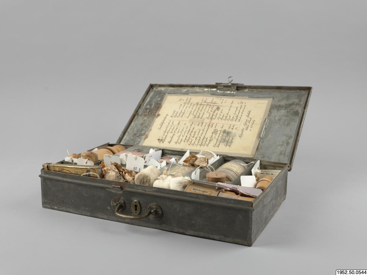 - Låda med medicin; med inventarier från Sven Hedins reseapotek från år 1899