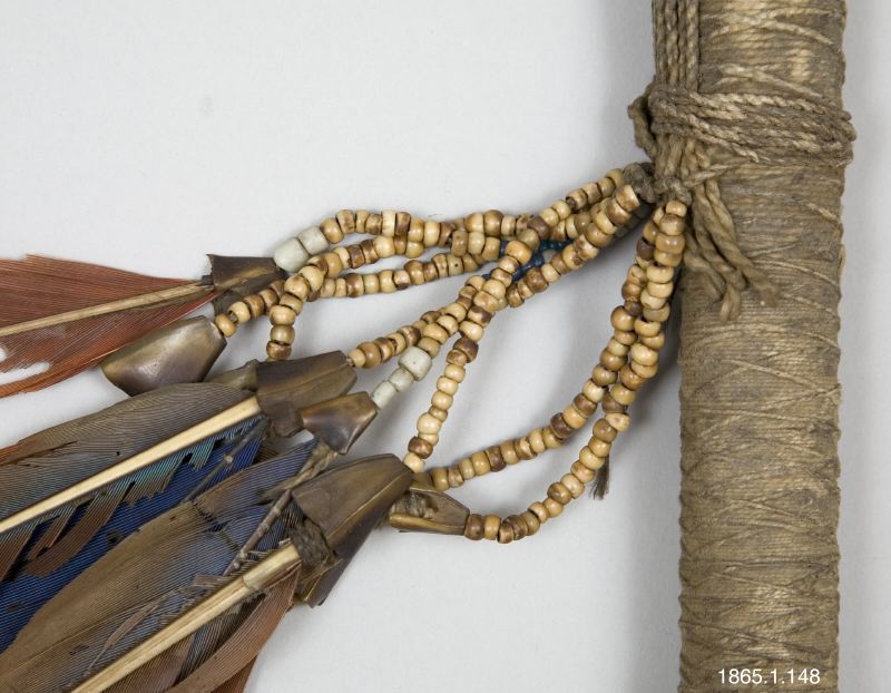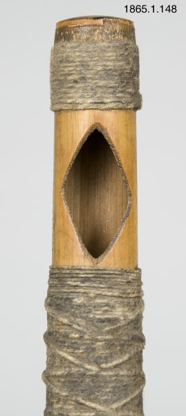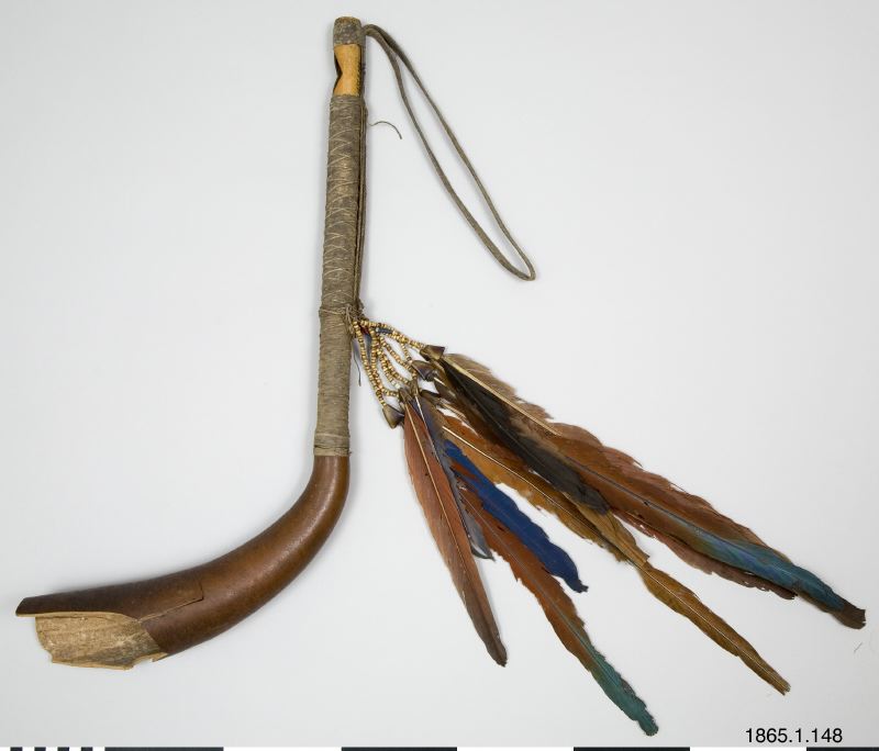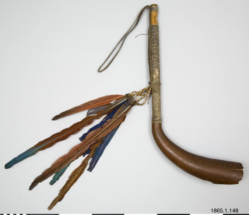 Trumpet. Kalebassen avbruten och sönder. Bred mynning som kraftigt smalnar av. Blåshålet romboidformat. Fjäderknippa med åtta snören är prydda med klövar, samt två även med glaspärlori blått, vitt och rött. Flätat band bildar en bärslinga. Längs trumpetens underkant är dess trådar inte flätade utan löper parallellt. En särskild bindning fäster fjäderknippet vid trumpeten. Denna anordning ger intryck av att vara en provisorisk lagning.