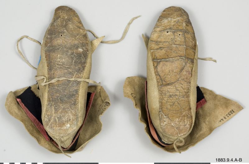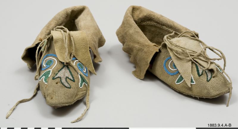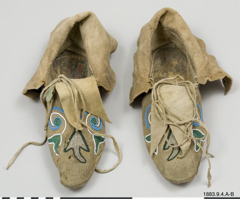 - Mockasiner av brett ljust skinn, prydda med rika pärlbroderier. Denna bär påskrift: 8499. Anno Assiniboins. Dacota 199. Dr. J. Urnhall. (Orig. nr. 2705)