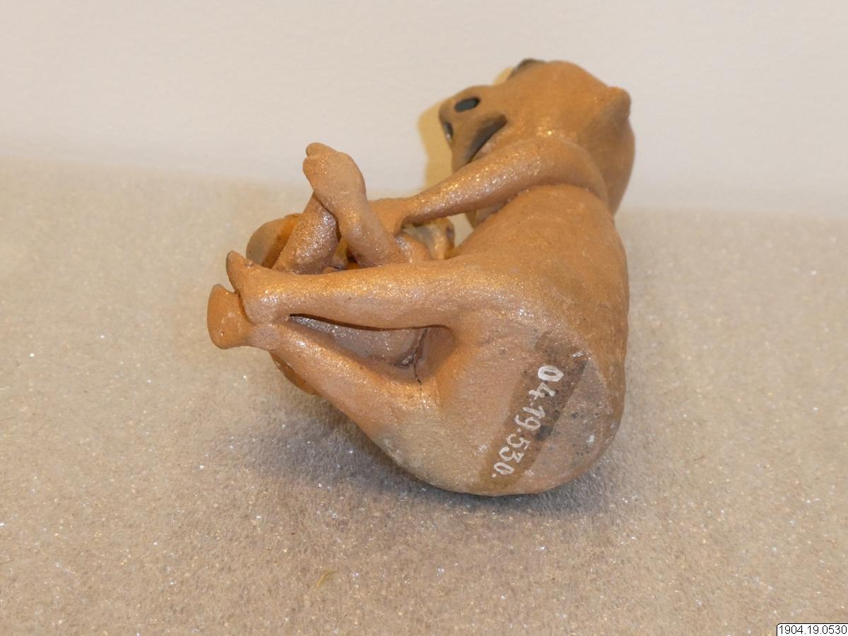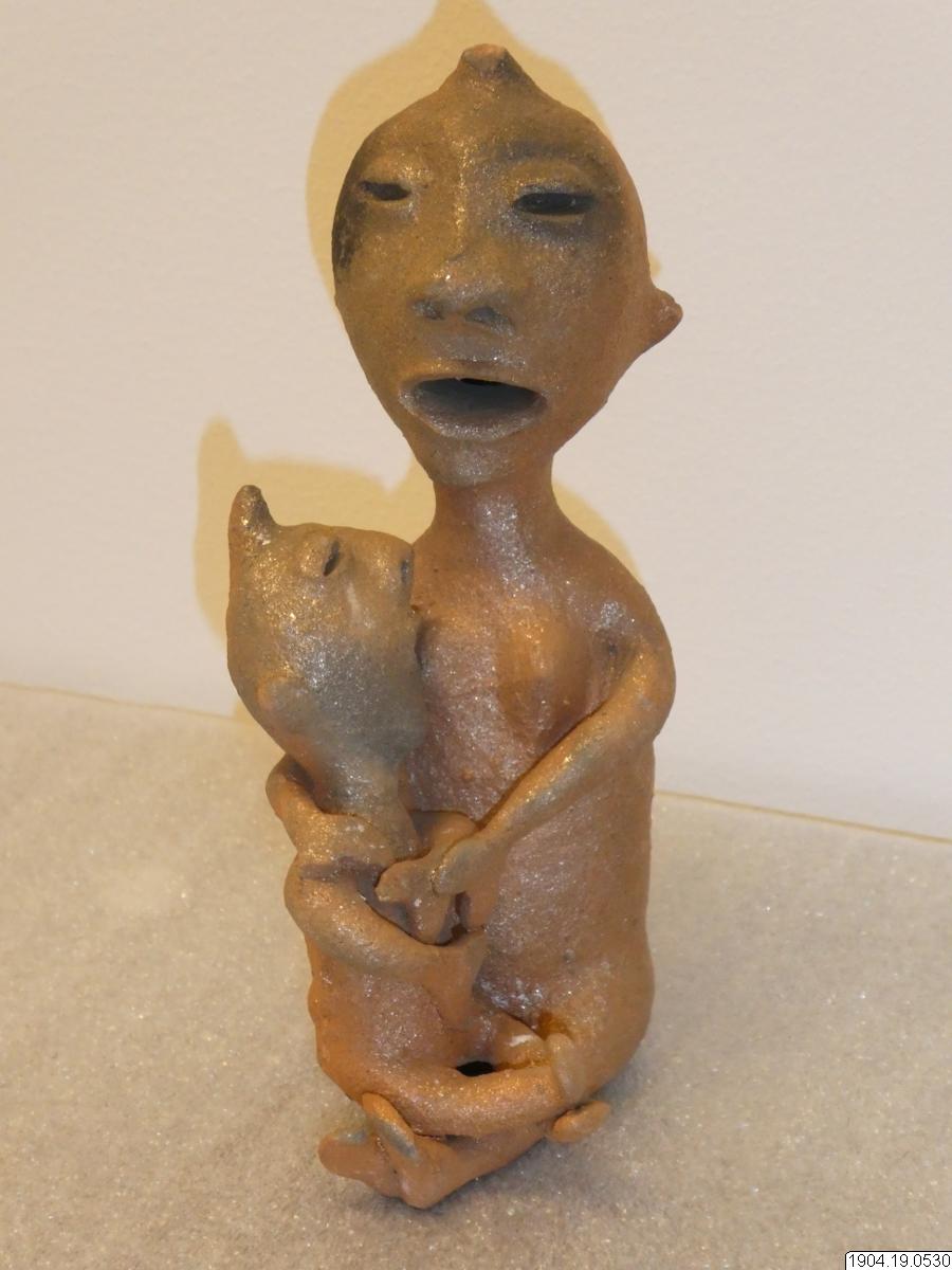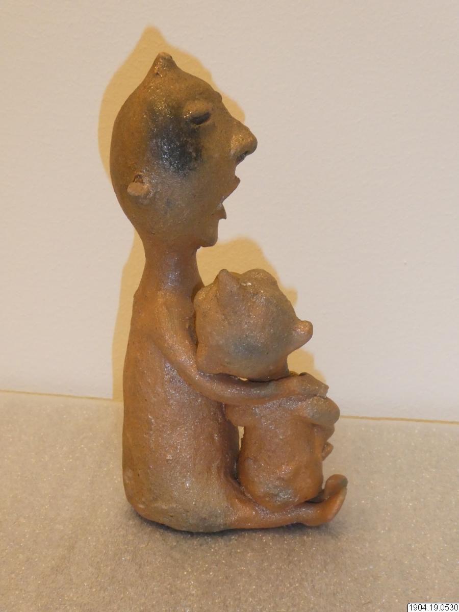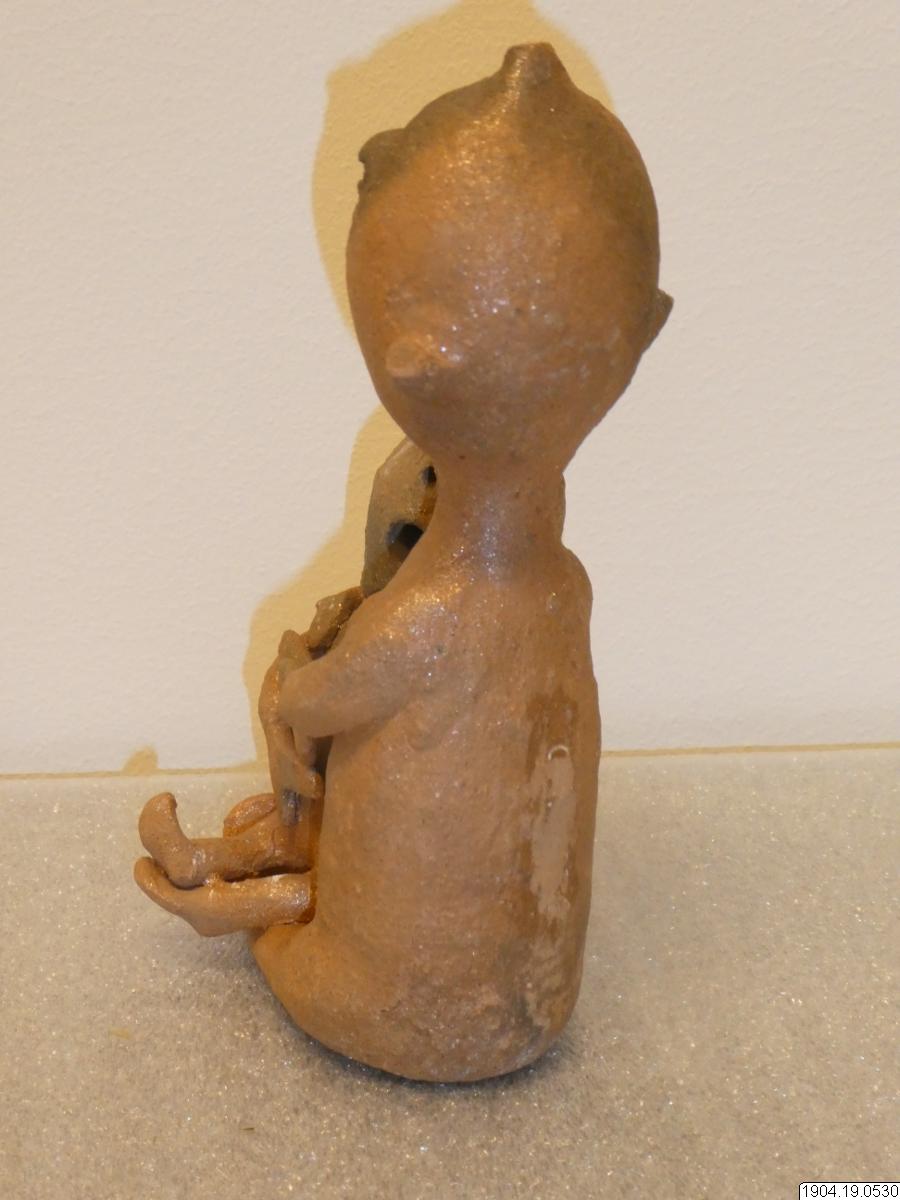 - Lerfigur, sittande kvinna med ett barn i famnen. Av gult, skimrande gods.