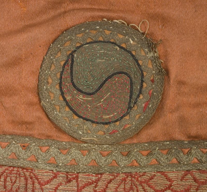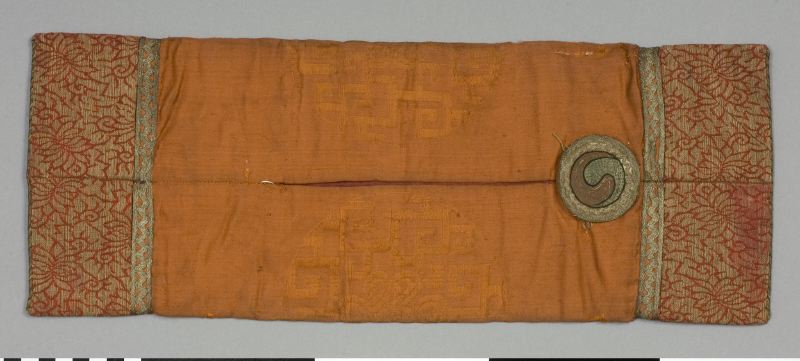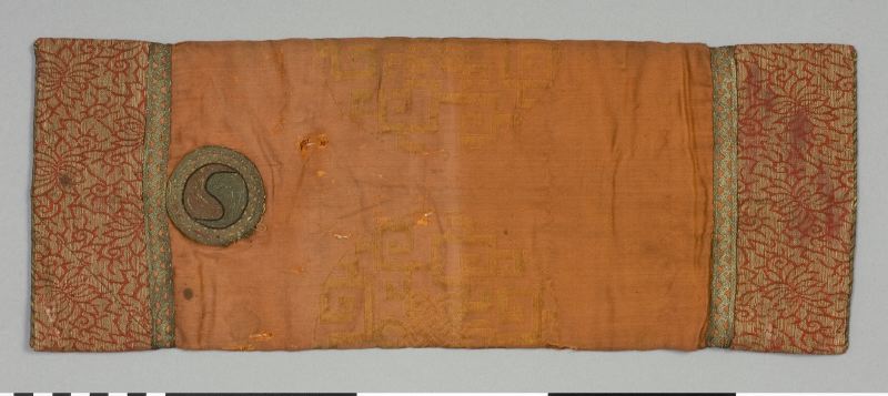 Fodral av tegelrött siden med öppning i längdriktningen mitt på baksidan. I kortsidorna ett mönstrat parti samt en rund knapp med broderat yin och yang tecken.