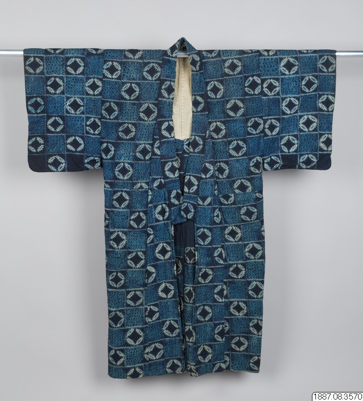 Kimono av indigofärgat bomullstyg, shibori-mönstrat (sydd och knuten shibori). Mönster av cirklar ("shippo") och rutor.