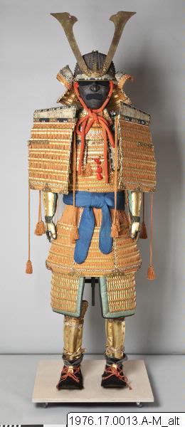 - Samurajrustning bestående av en hjälm, en ansiktsmask, bröst- och ryggskydd, skört, ett par axelskydd, ett par armskydd, ett par benskydd och ett par skor. (AU)