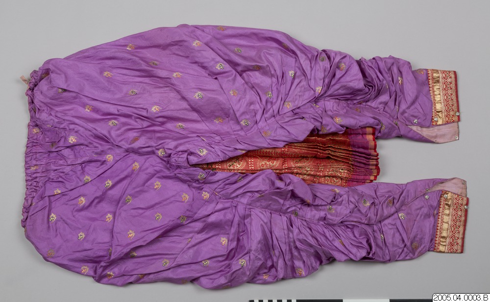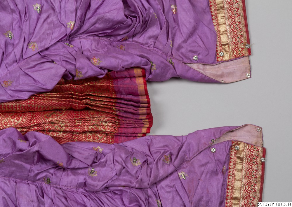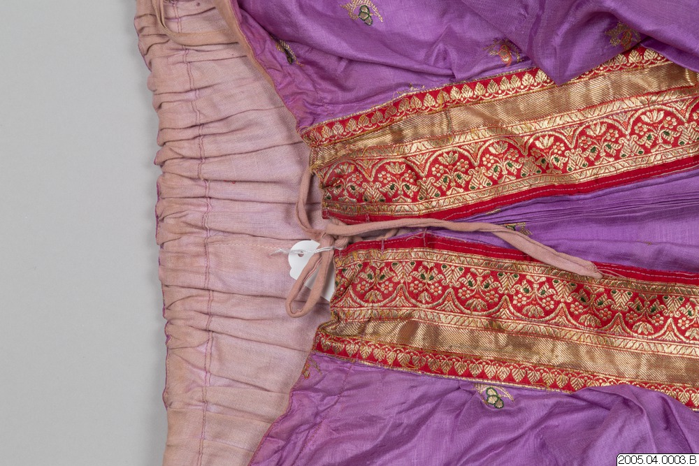 Dräktbyxor av violett siden med inplockat mönster, bårder av vävda band i rött, grönt och metalltrådar runt vristerna, längst insidan av benen, samt ett veckat parti av samma textil mellan benen. Fodrade med ett bomullstyg i ljusare violett.