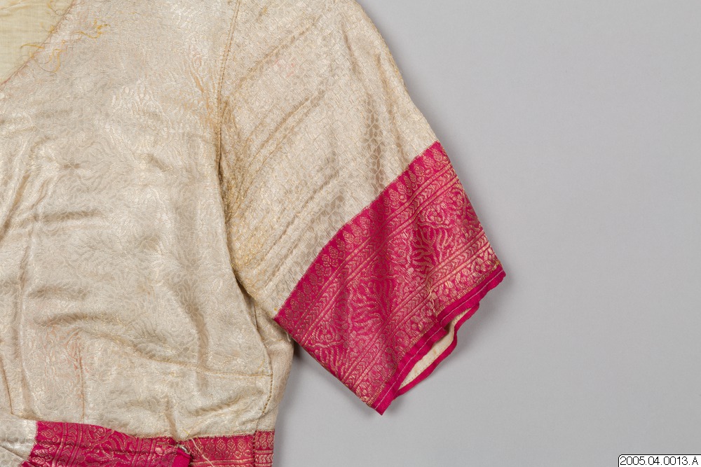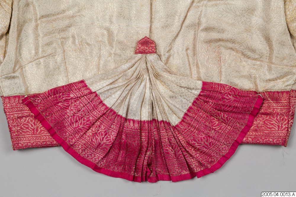 Dräktöverdel i vitt och rött. Textilierna är mönstrade av invävda metalltrådar. I ryggen på dräktjackan en dekoration av tyg som veckats och hänger som en uppochnedvänd solfjäder, fastsatt med tryckknappar.