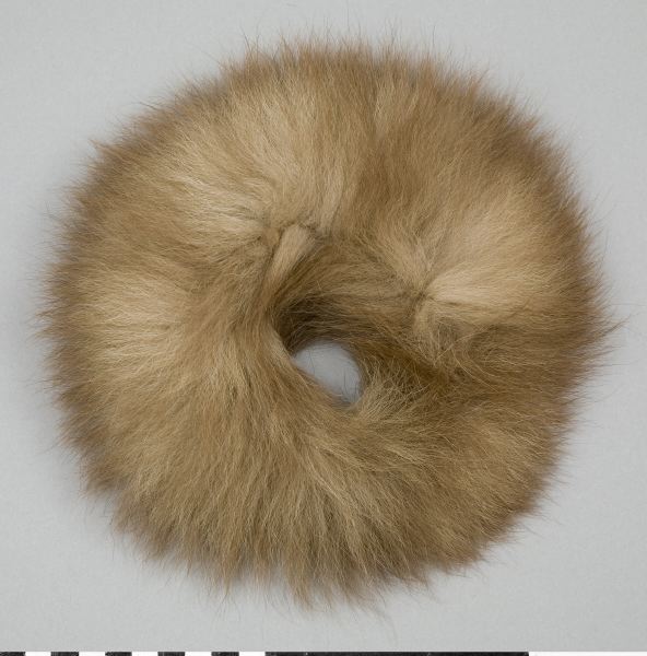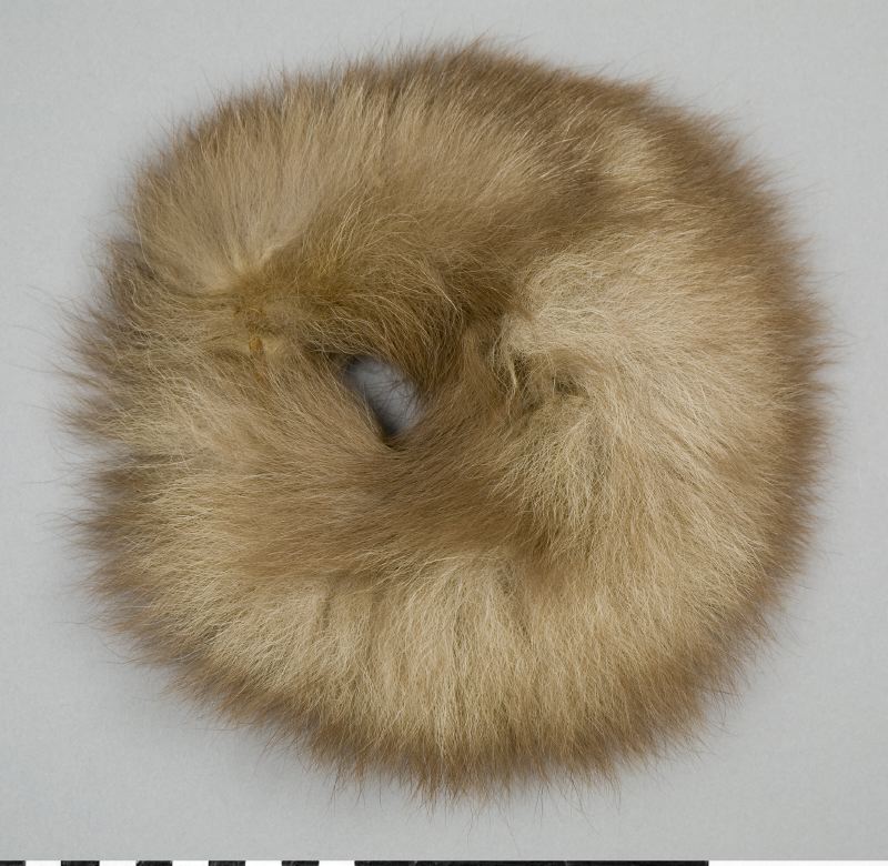 - Brunaktig lös pälsmanchett(?) eller liknande, ihopsydd i ring. Se Omärkt 834 som åär likadan och eventuellt har tillhört samma föremål.