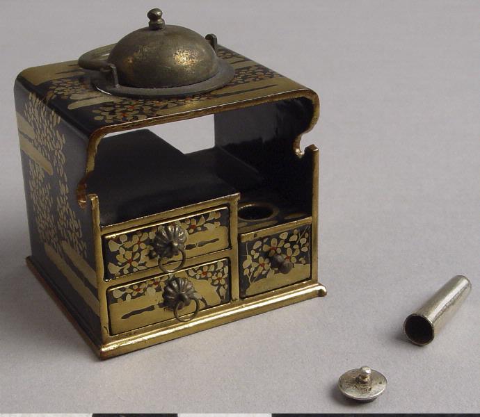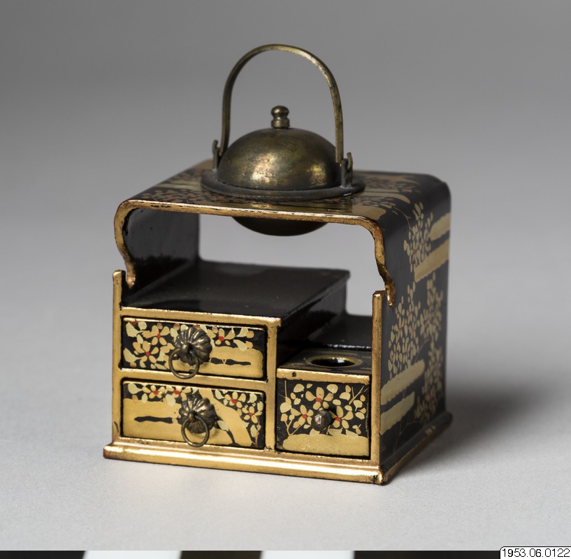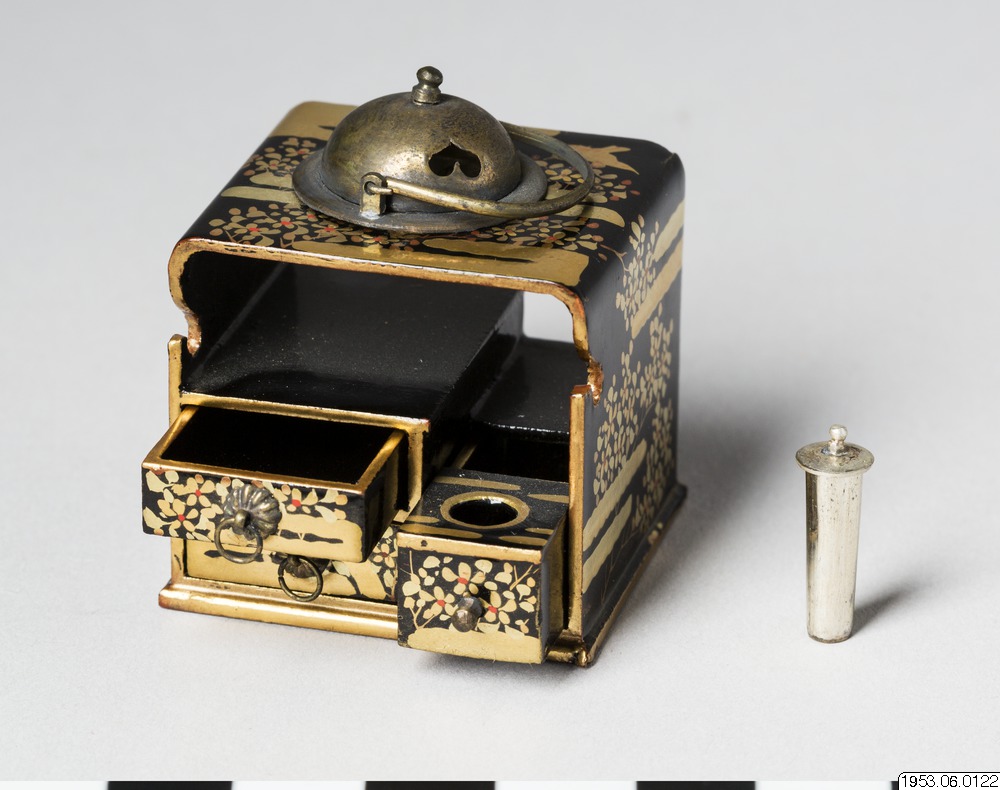 Japansk miniatyr i form av liten byrå med lådor, metallkärl i nedsänkning, en silverburk med lock.