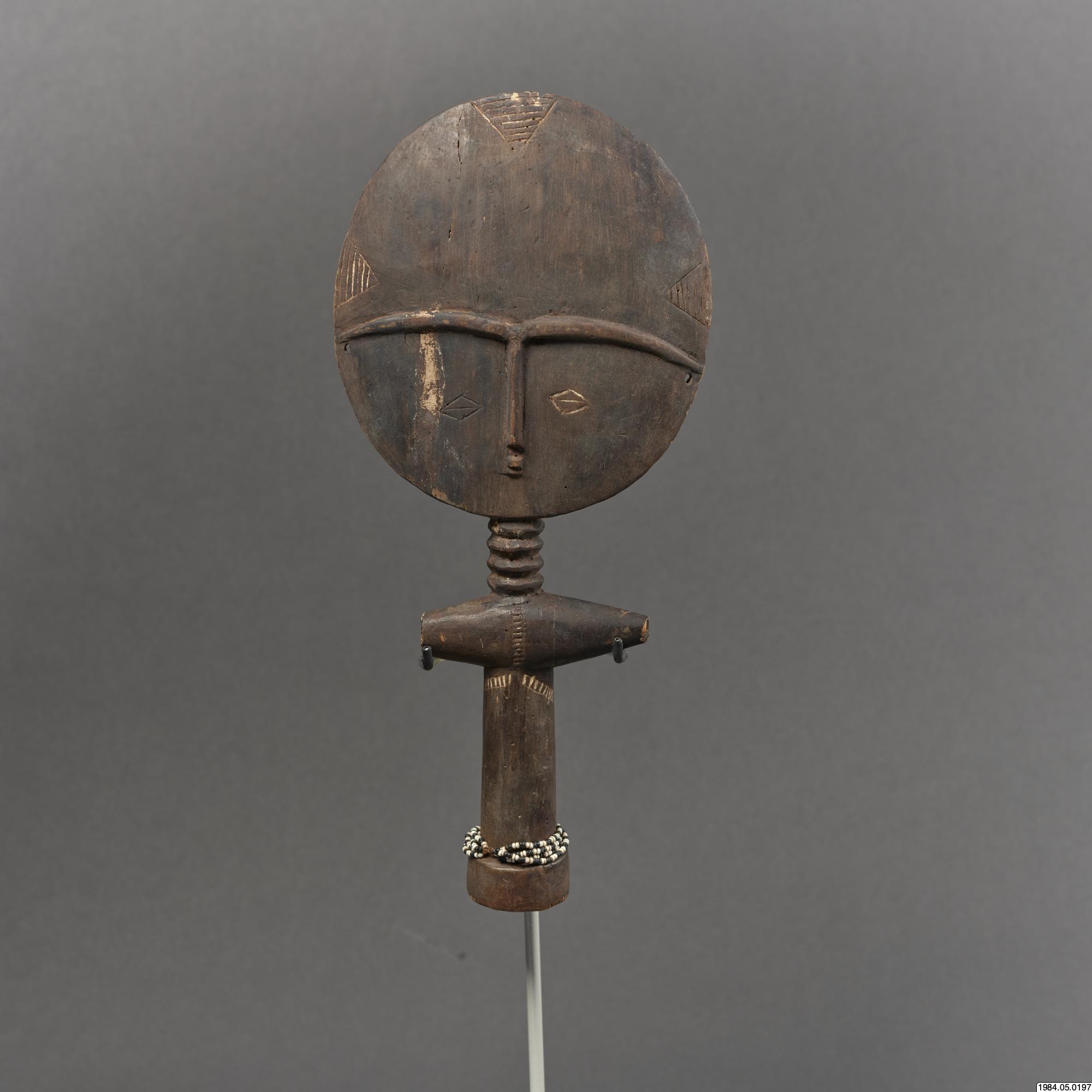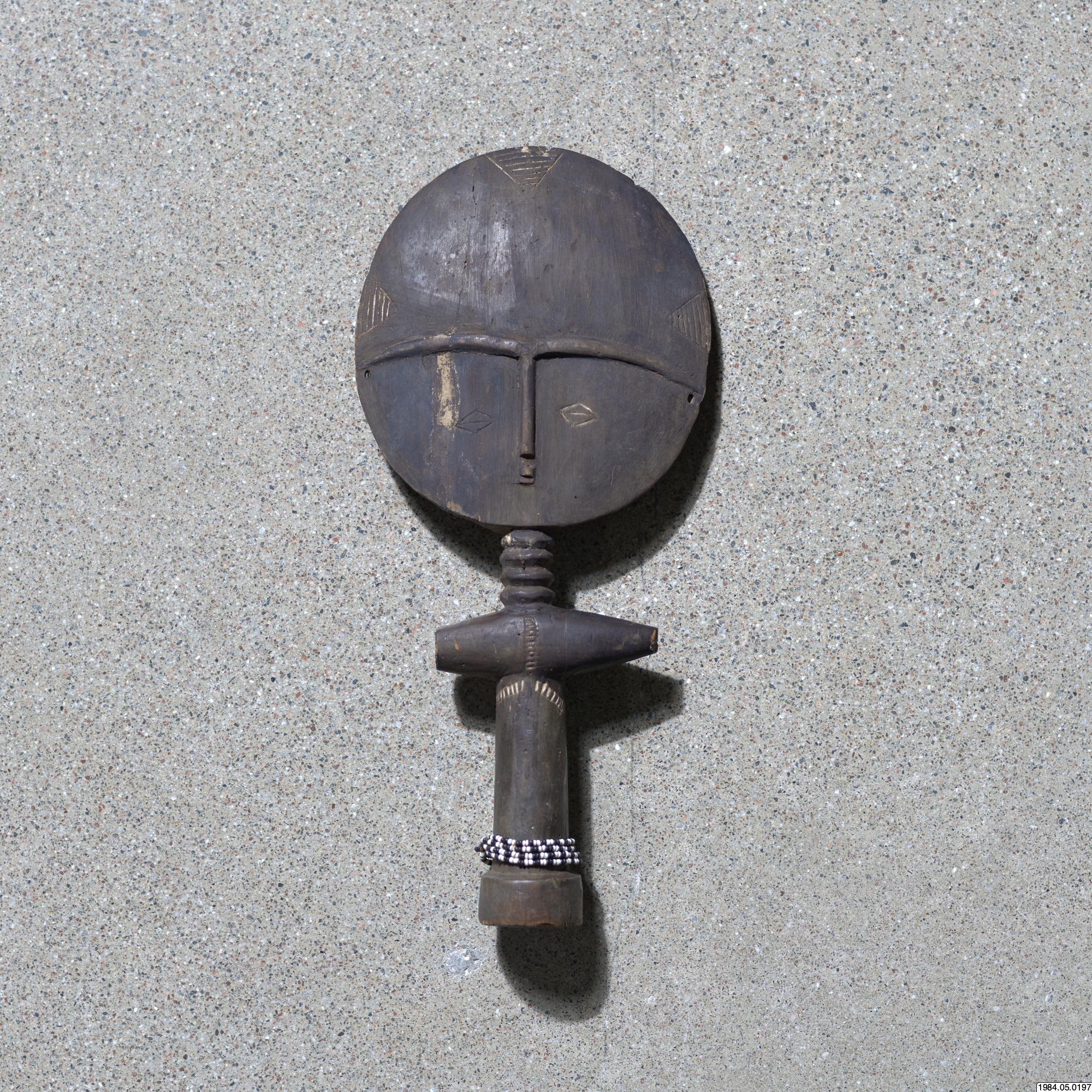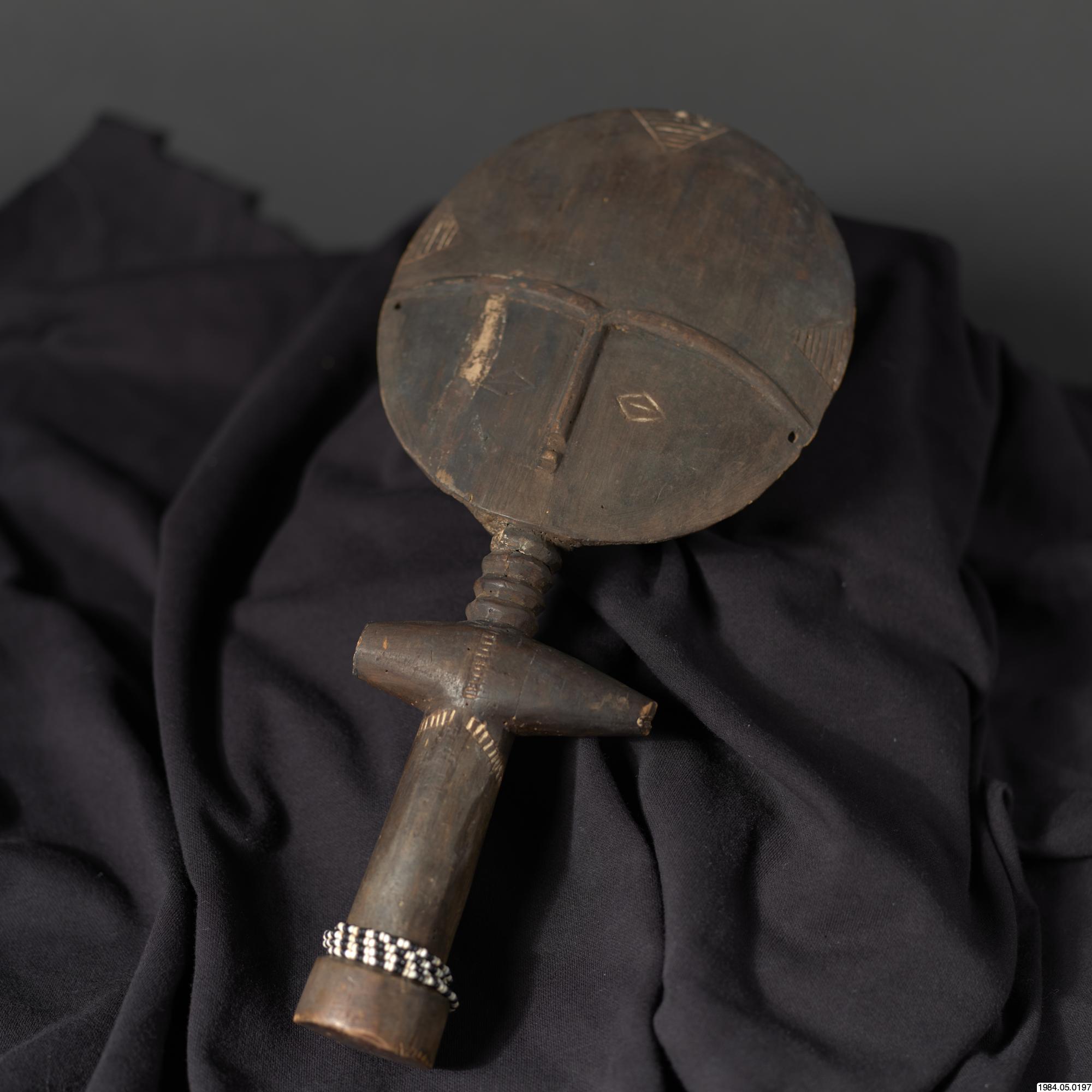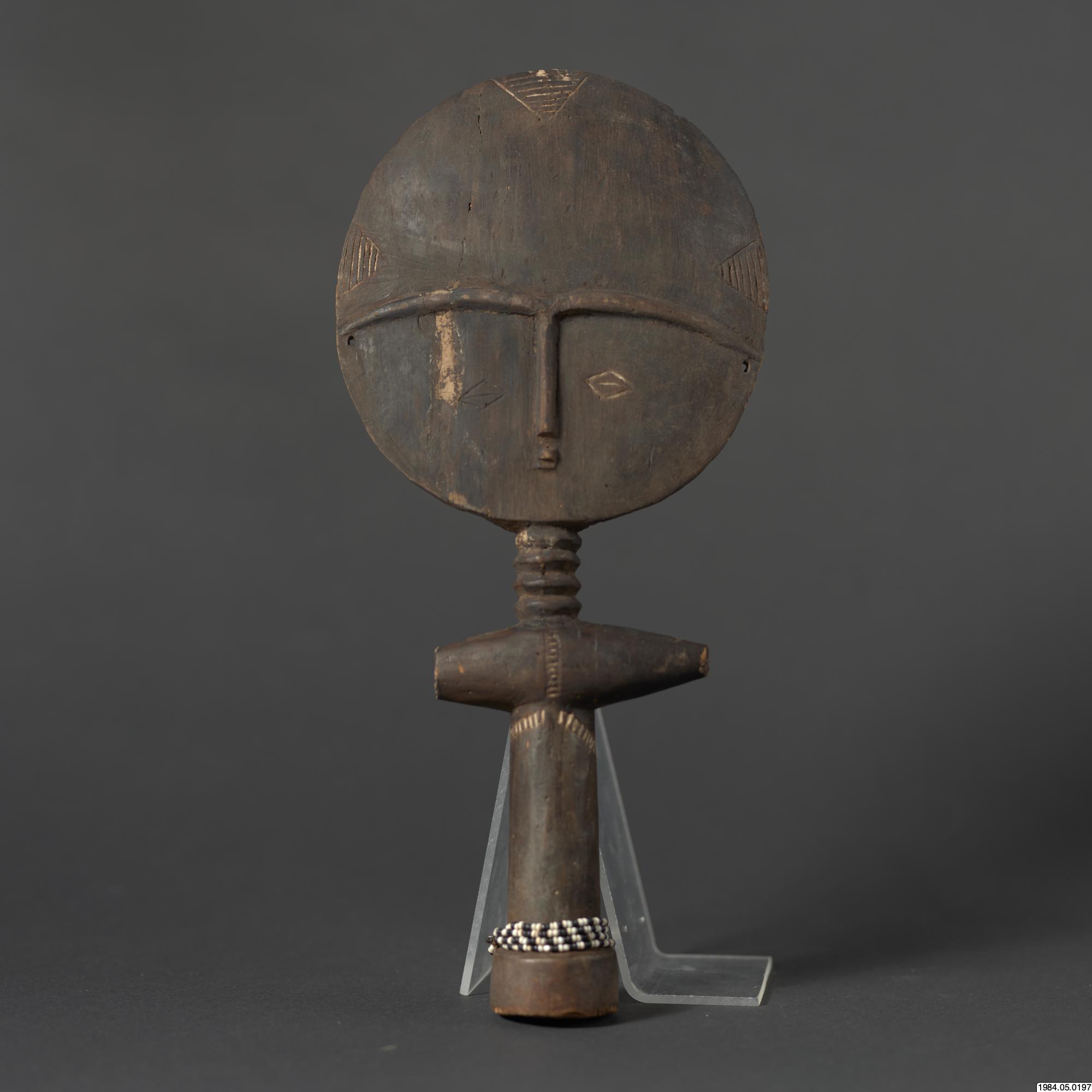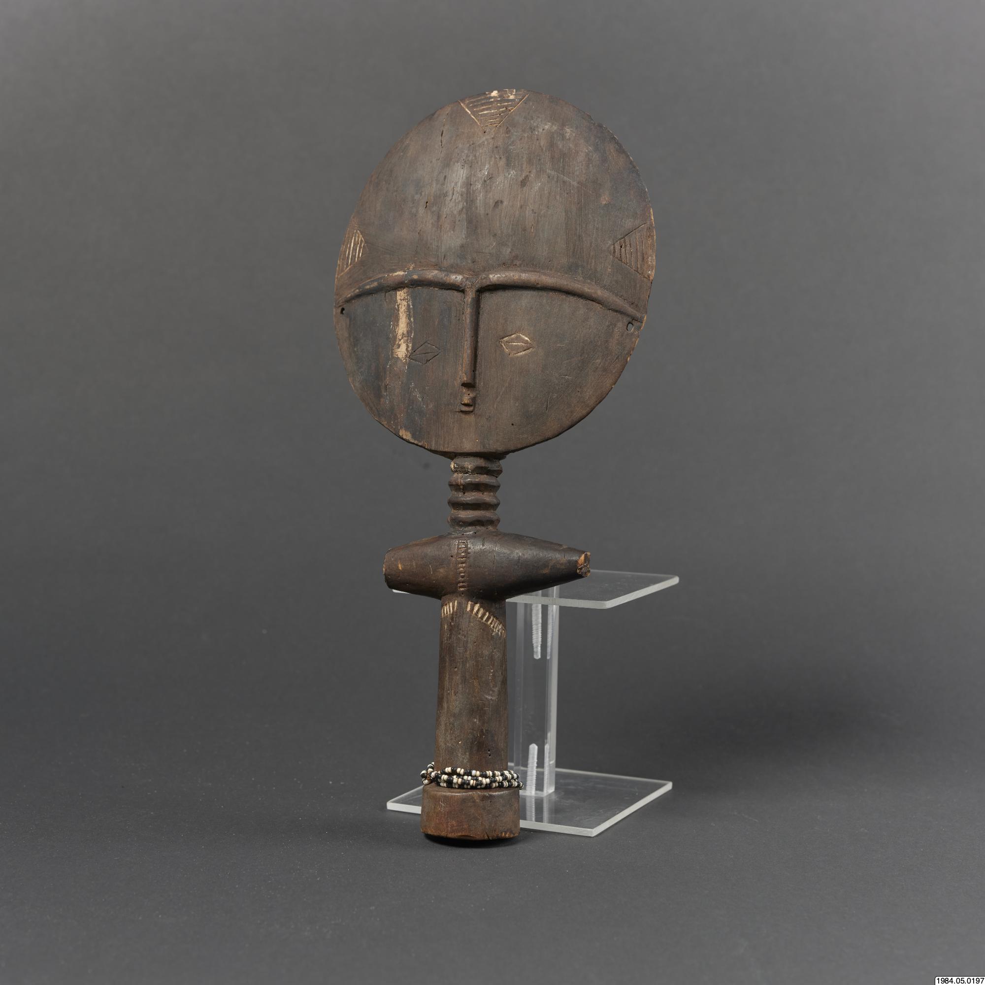 - Fertilitetsdocka av trä. Rund, avlång kropp med rund skiva som huvud. Snidad och ristad dekor. Kring kroppen ett halsband av vita och svart glaspärlor.