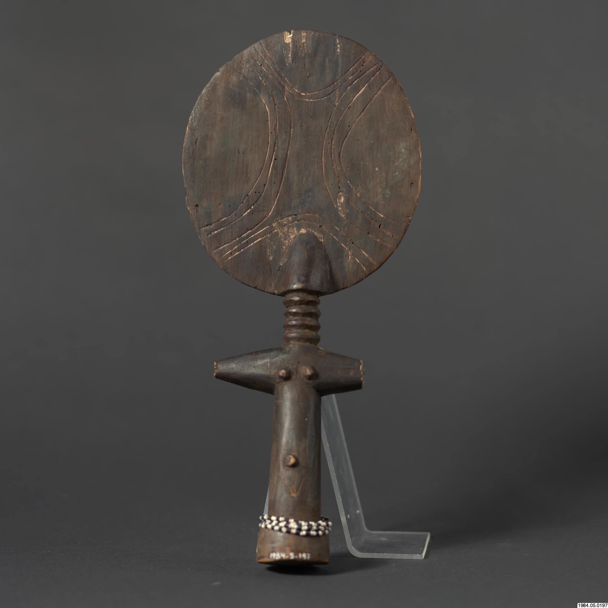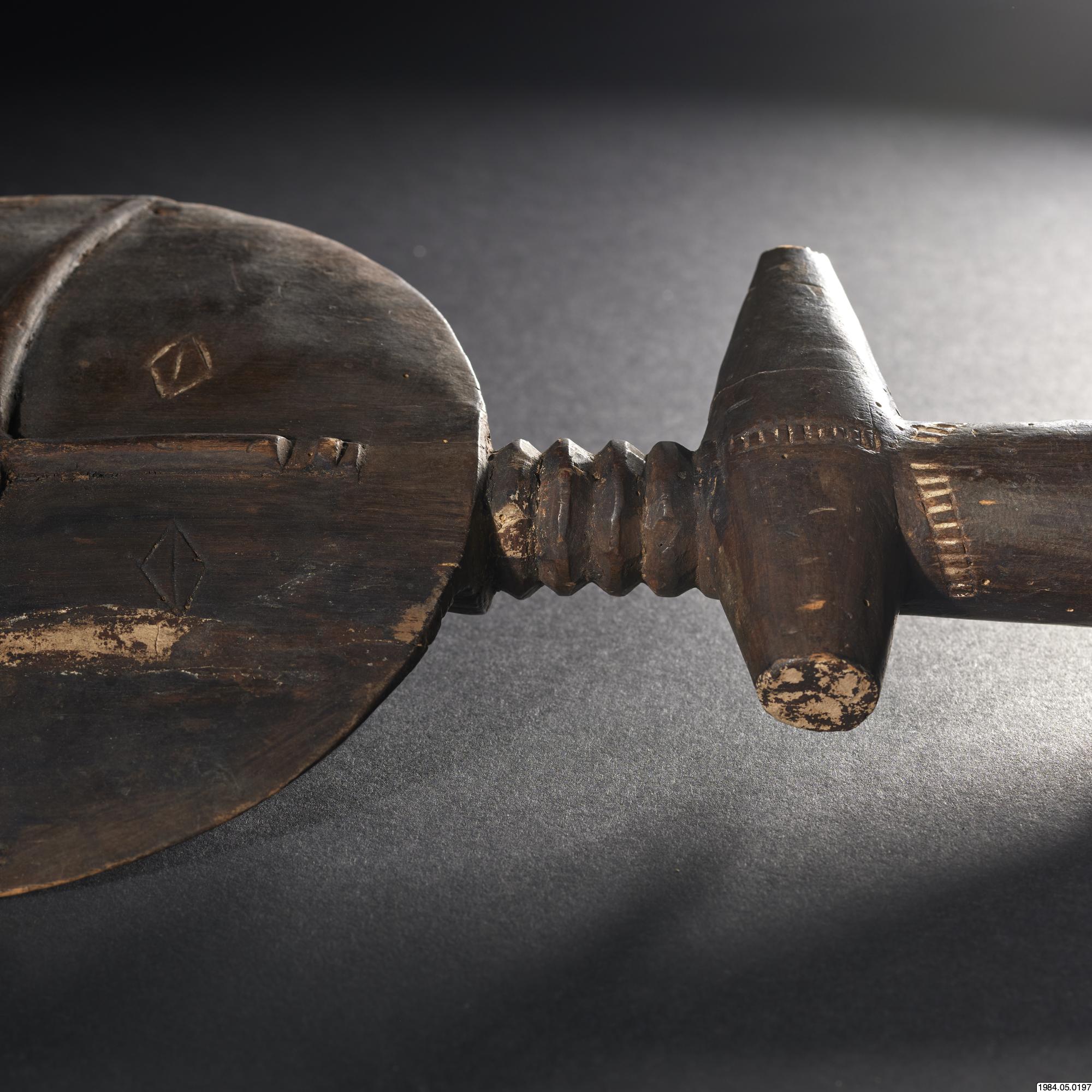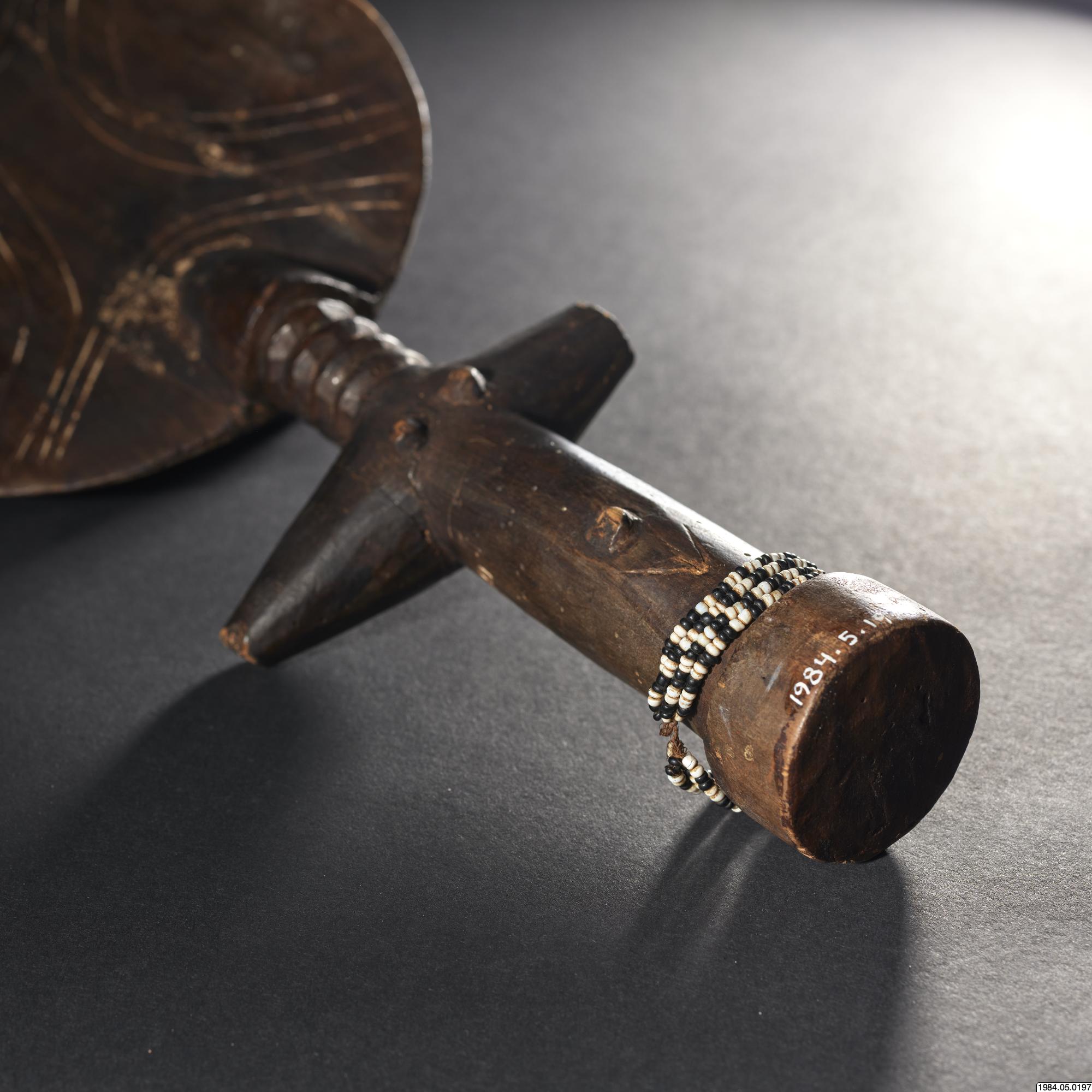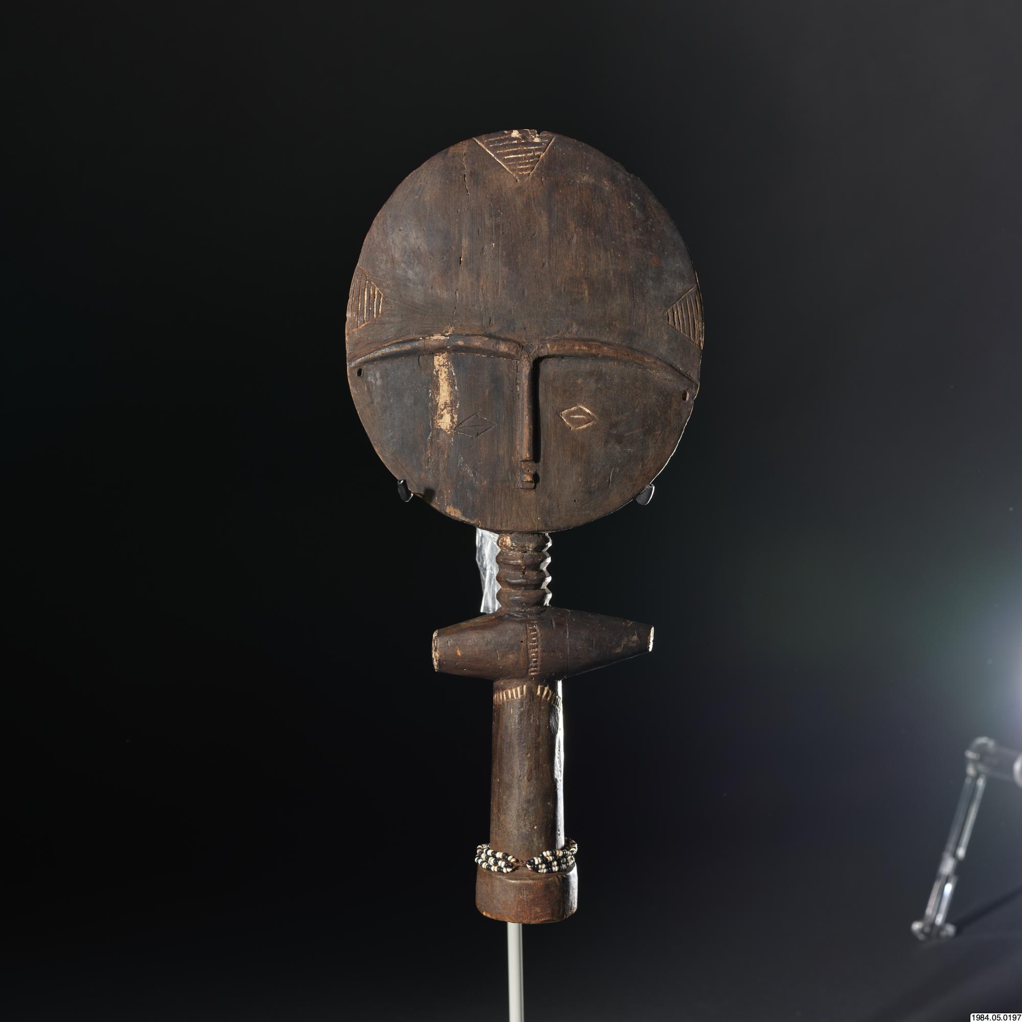 - Fertilitetsdocka av trä. Rund, avlång kropp med rund skiva som huvud. Snidad och ristad dekor. Kring kroppen ett halsband av vita och svart glaspärlor.