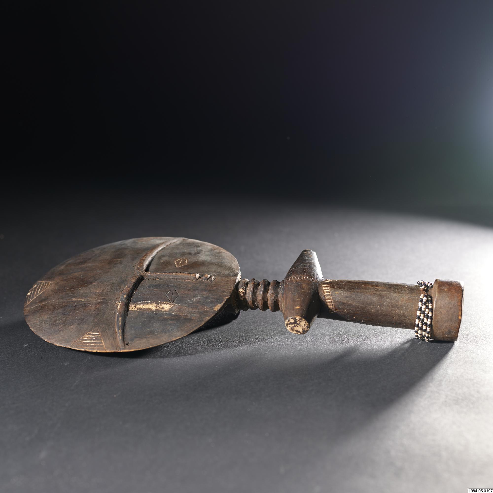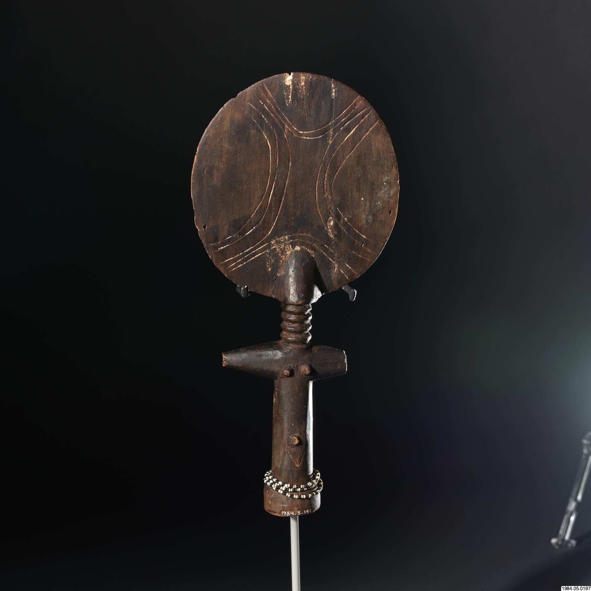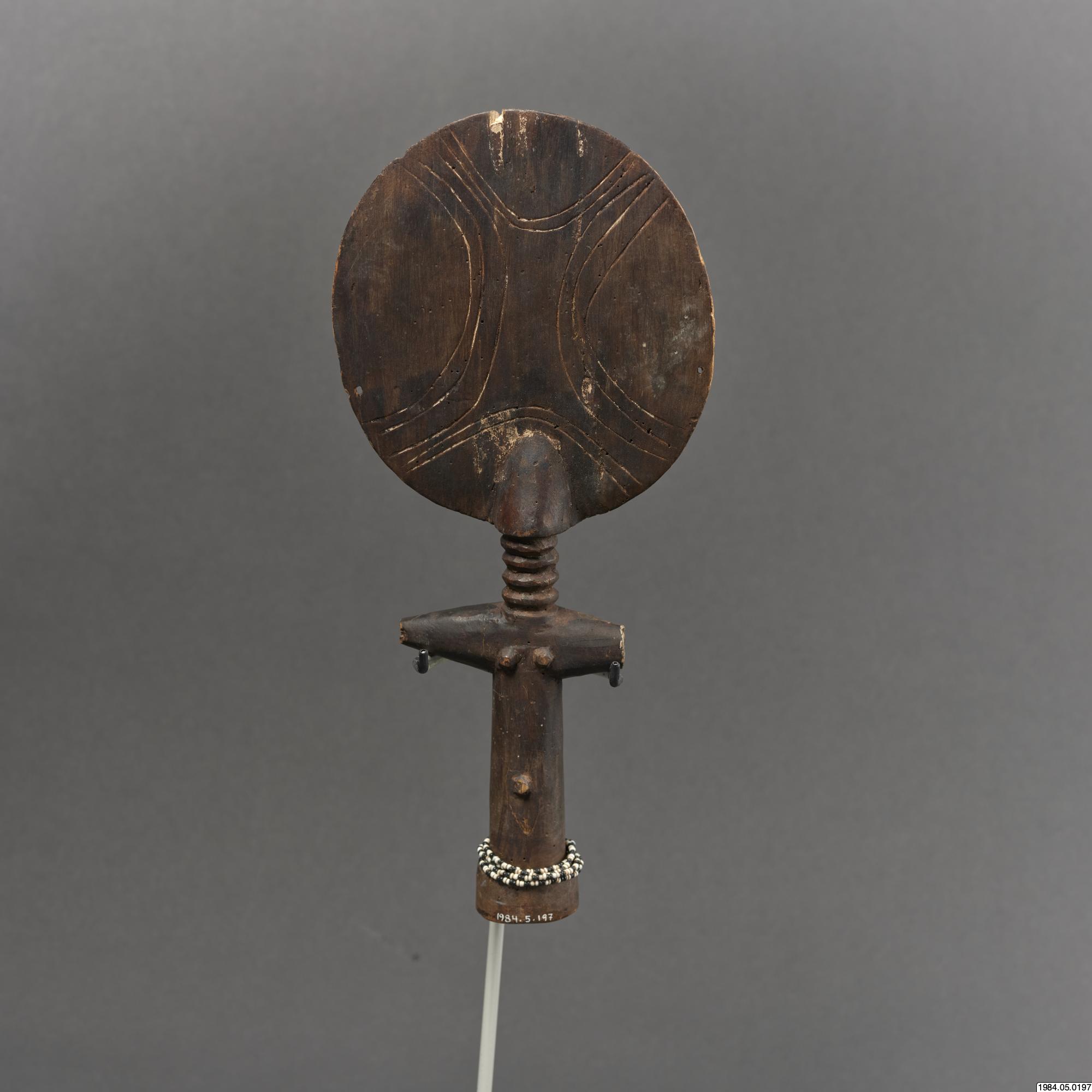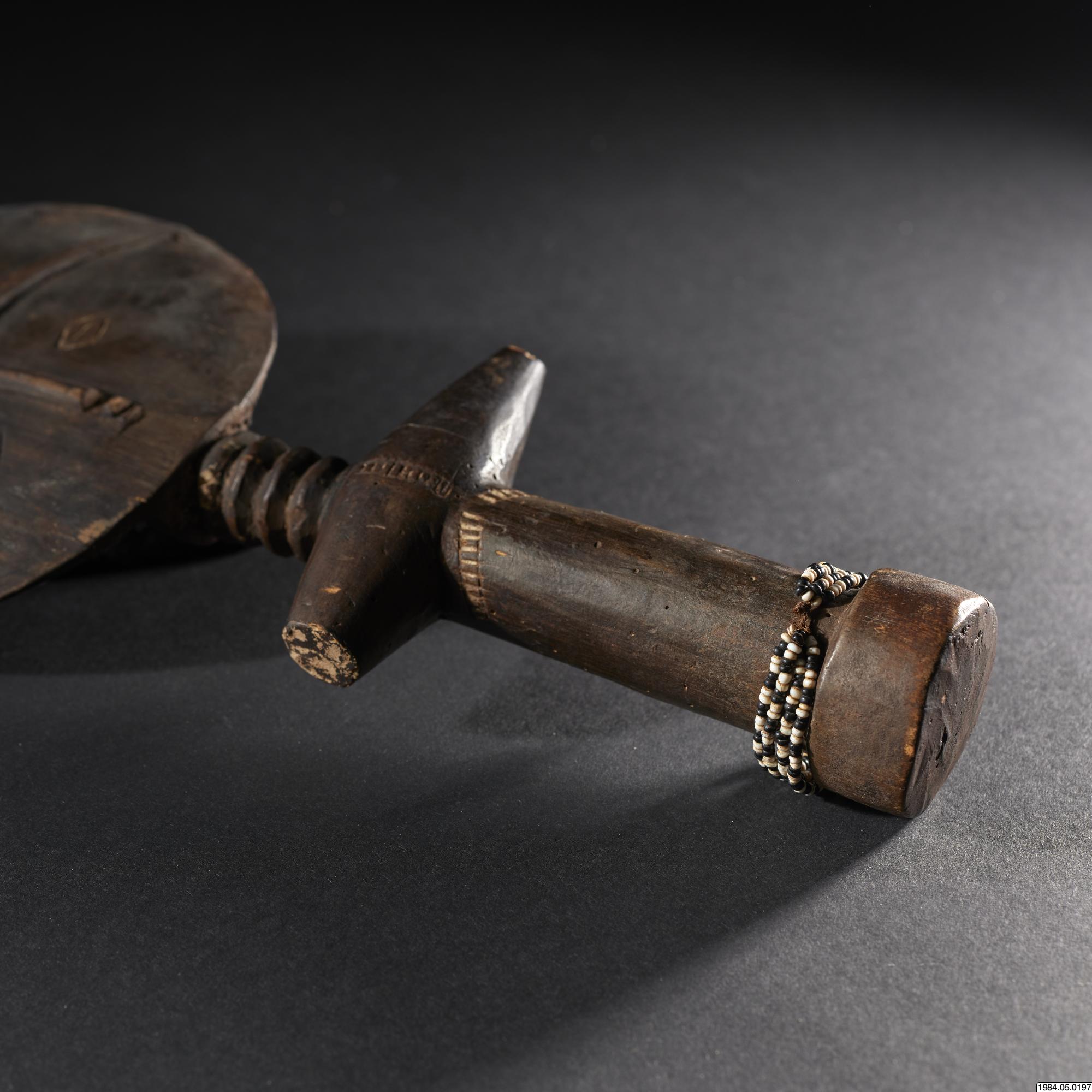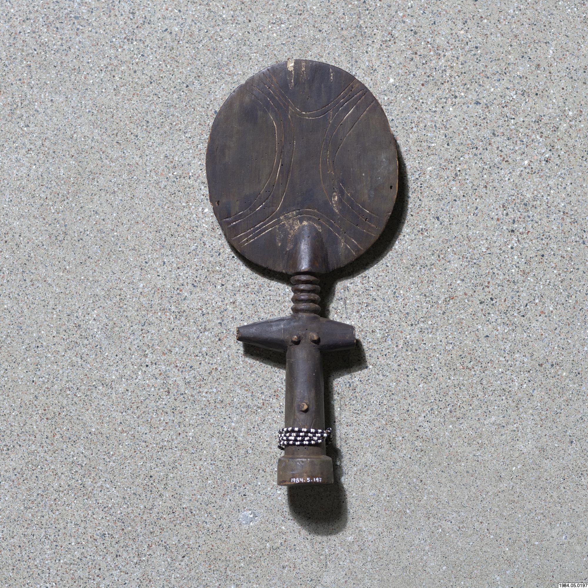 - Fertilitetsdocka av trä. Rund, avlång kropp med rund skiva som huvud. Snidad och ristad dekor. Kring kroppen ett halsband av vita och svart glaspärlor.