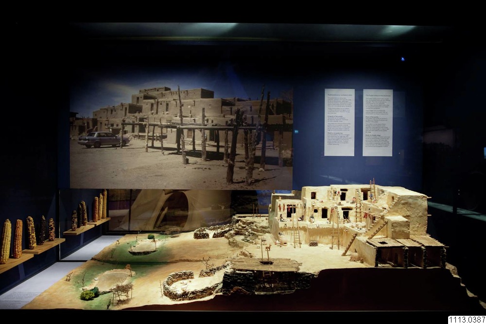 - Modell av en puebloby, ett färgfoto med en by och en bil samt sex majskolvar.