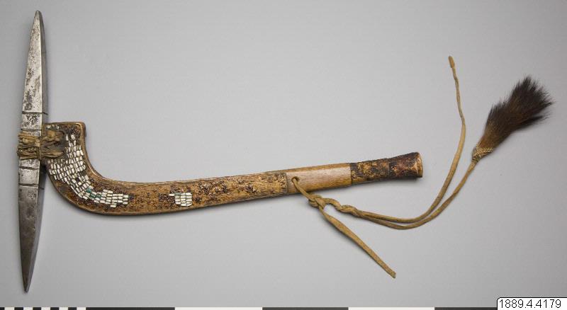 Stridsyxa, "tomahawk", "indiansk hake". Yxblad av stål (A), fyrsidigt och spetsigt i båda ändar, på mitten fem "skuror" för fästning vid skaftet. Skaft (B) av trä, kort, platt, krokigt/böjt, inlagt med små gröna och vita "benbitar" (snäckskal, "wampum"). Det mesta av beninläggningen är borta. 1600-tal. Här finns även gröna glaspärlor.