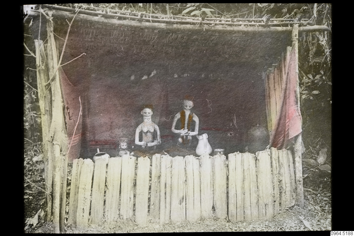 På platsen hittar man också tygbitar och skrärvor av kalebass. På marken syns krukor, hela eller trasiga, fat och grytor, små stavar dekorerade med pärlor och en liten stav med fjädrar.