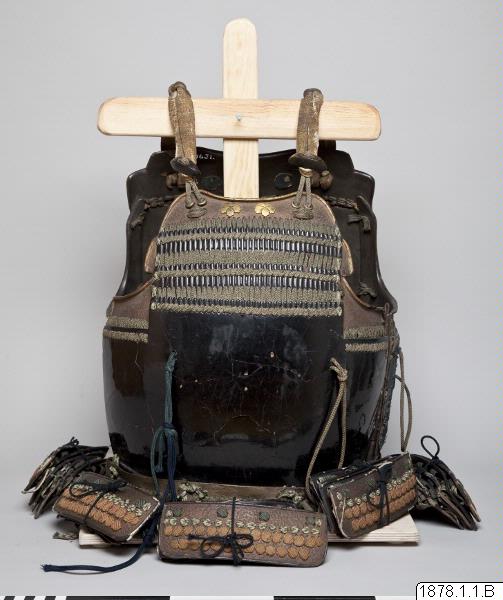 Rustning av lackerad järnplåt m.m., bestående av harnesk, axelklaffar, kask, arm- och lårbeteckning samt benskenor, en rödlackerad ansiktsmask, och ett par mörkblå sockor, tabi, de senare eftergjorda. (Enligt generalkatalogen)