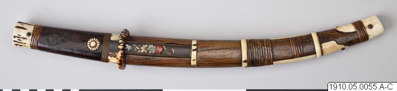 Daimiosvärd med slida. Fäste och slida äro rikt ornerade genom omvirad och infälld rotting men framför allt genom rika inläggningar av elfenben. På framsidan av slidan den vanliga lilla harakirikniven. Dess skaft är på sidorna och baksidan guldlackerat, på framsidan företer den, mot en mörk matt bakgrund, (forts.) en vinlövsranka i upphöjt arbete/utförd i guldlack, rött och grönt lack samt, vad det översta bladet beträffar, i pärlemor. Å baksidan av svärdets slida och handtag finnes i elfenben utförda ringar för gehänget. (Enligt generalkatalogen).