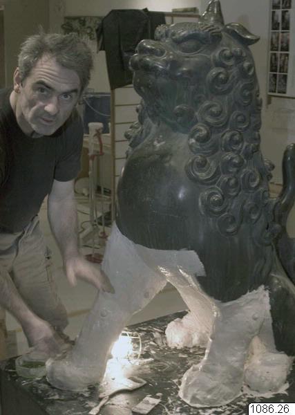 Enligt kataloguppgift markerar den hornliknande upphöjningen på huvudet att det är den manliga parten av ett par väktarlejon. Som vanligt i japansk konst har hanen gapet slutet, då han avbildas i en inandning. Detta lejonpar har antagligen varit placerat som väktare vid ingången till ett tempel eller ett palats. Hanen har då sin plats till vänster, honan till höger./CR (Uppgifter från generalkatalogen). Citat ur d:o: "År 1939 uppställdes lejonen på socklar av sten på museiområdet (byggnaderna 3 och 4). Socklar och uppställning bekostades av hovjuvelerare K. Andersson med maka." (PH)