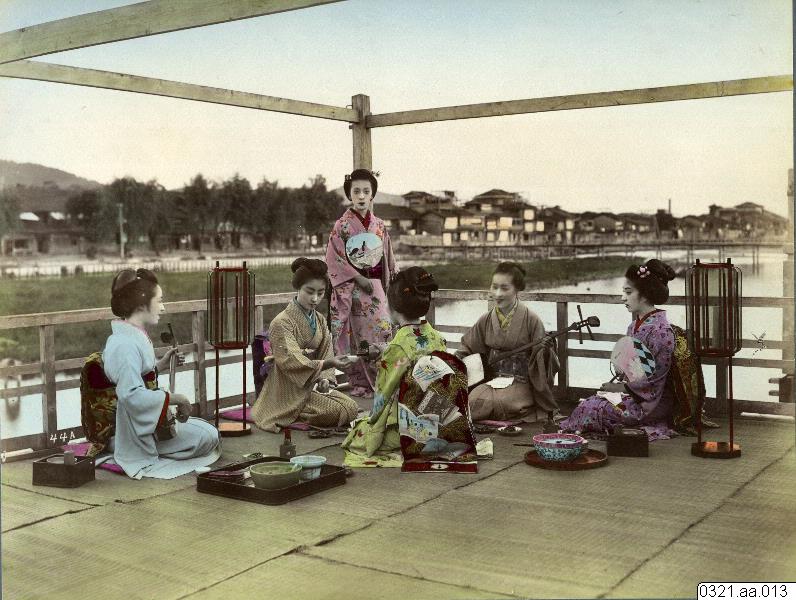 - Ett flertal kvinnor har musikinstrument och te med sig vid en veranda med utsikt över vatten och hus. De ser ut att ha det trevligt.