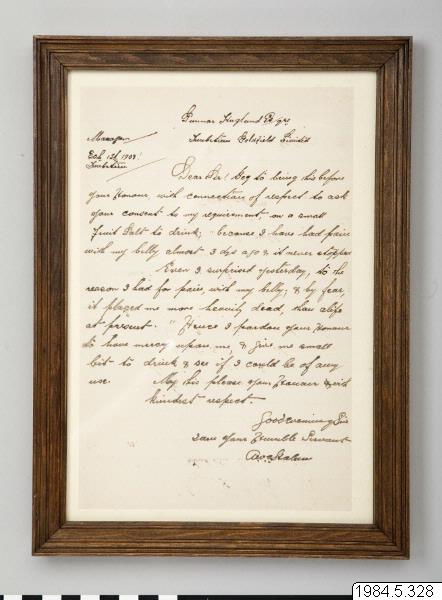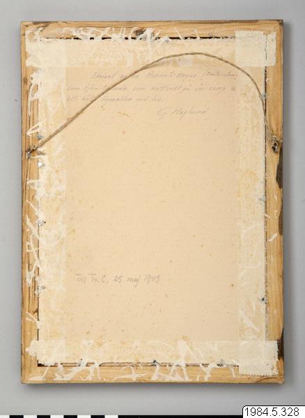 - Tavla; inglasat brev. Träram. Brevet skrivet med bläck, daterat 1909. På baksidan av tavlan står det med blyerts: "Skrivet av en Ashanti-neger (Bantu-stam) som tjänstgjorde som nattvakt på vår camp för att hålla lägerelden vid liv. G. Haglund."