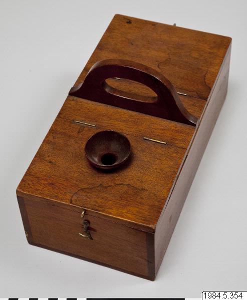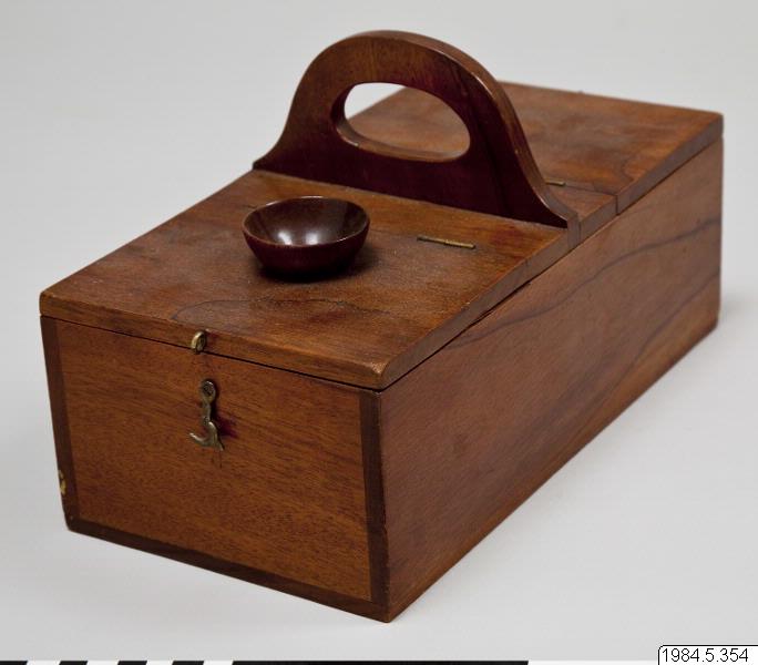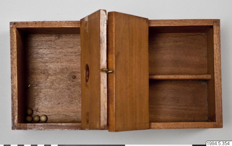 - Balloteringslåda av trä. Avlång, med två lock och skilda avdelningar. På ena locket en öppning för att stoppa ner kulor. Handtag tvärs över lådan. Lådan indelad i tre fack. Mässingskrok som låsanordning. Inuti lådan fyra vita kulor.