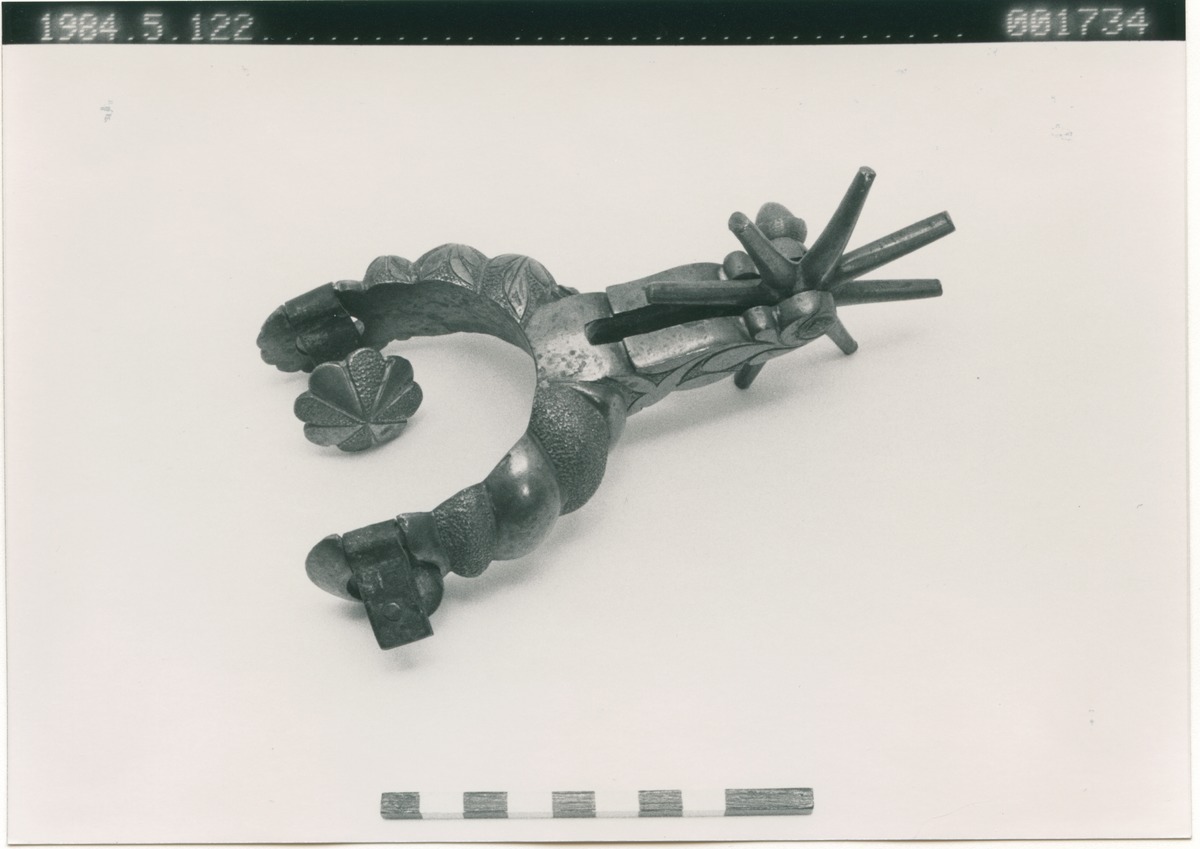 - Sporre av gul metall (mässing?). Bygeldelen vriden, på ena yttersidan bladornamentik. Hål i bygeln för remmar. Vid hålen nedhängande knappar. Stor trissa med åtta uddar baktill.